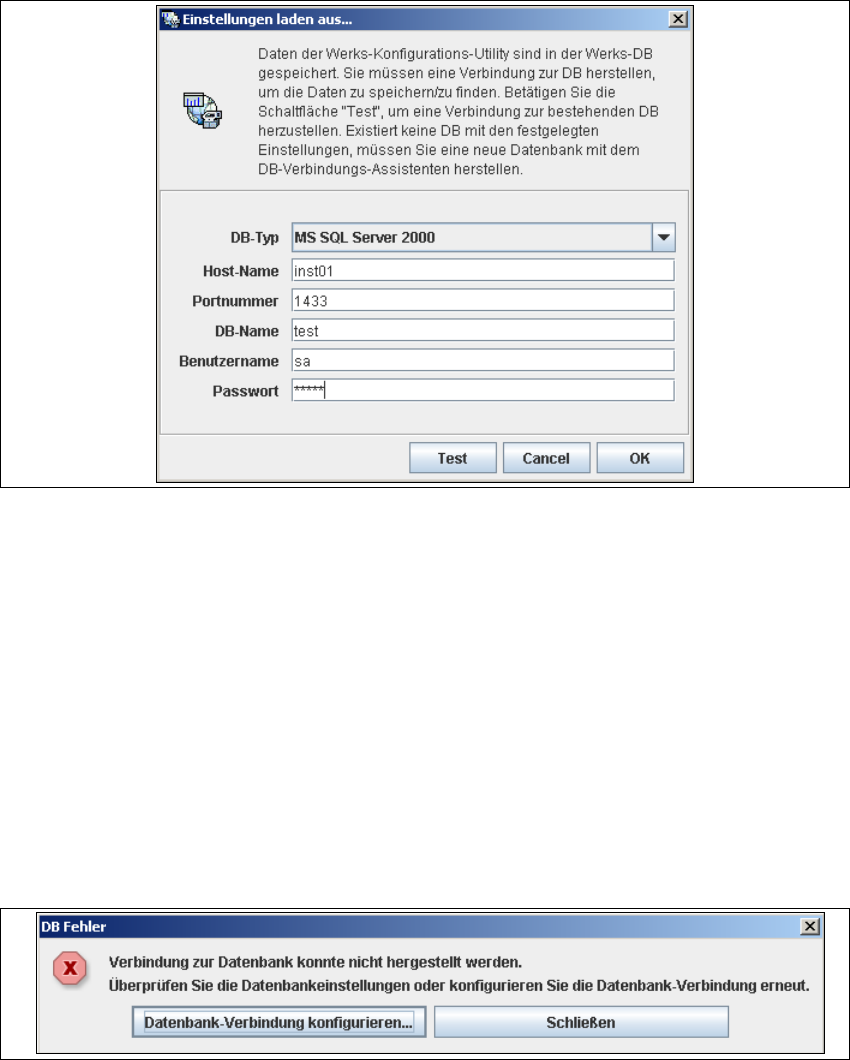 Setup-Sequenz für den Datenbank-Verbindungs-Assistenten, um die Werks-Datenbank