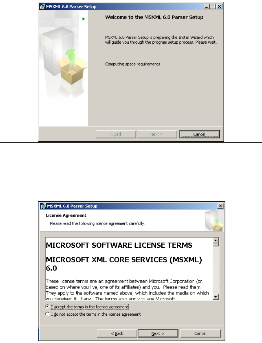 → Klicken Sie auf Install (Installieren). Der eigentliche Installationsvorgang von MS XML 6.0 wird