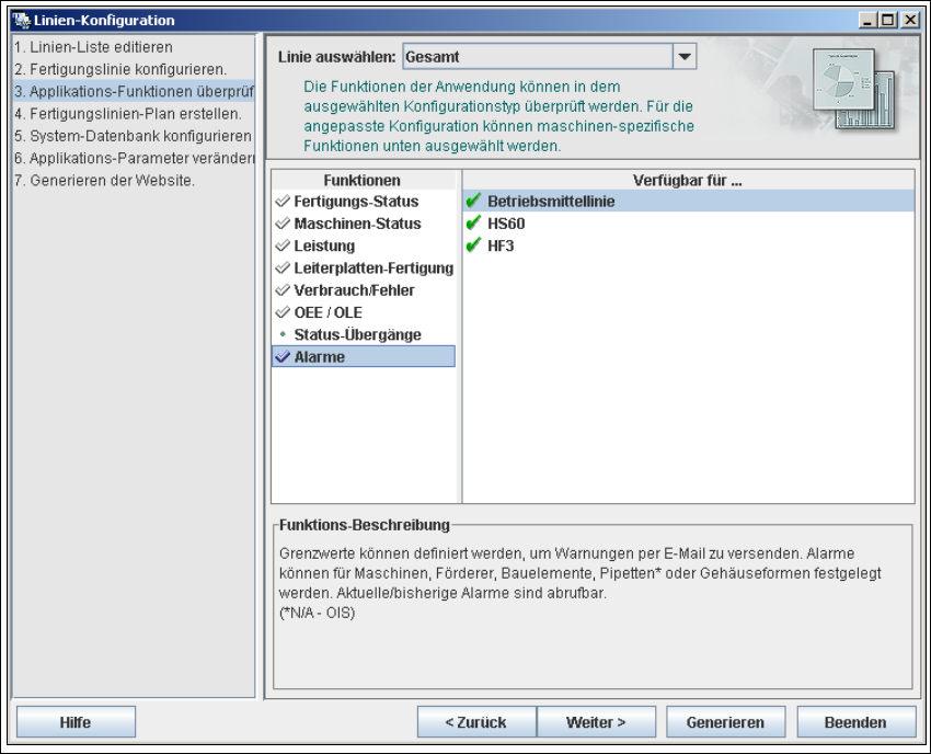 → Nachdem Sie alle Funktionen für alle Maschinen und alle Fertigungslinien ausgewählt haben,