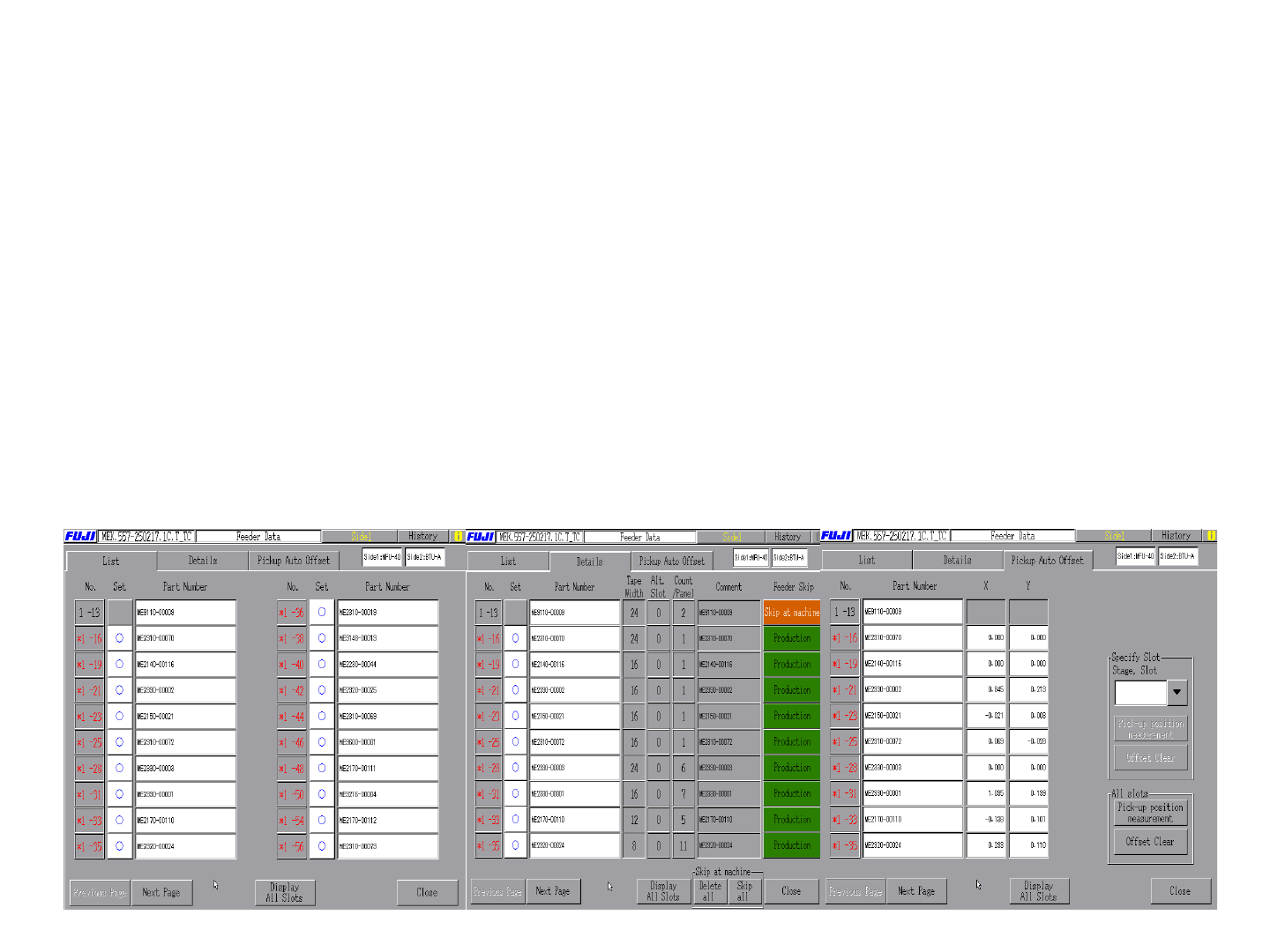 点击feeder data显示在生产程序中使用的料站状态,进行料站跳过设定的画面.