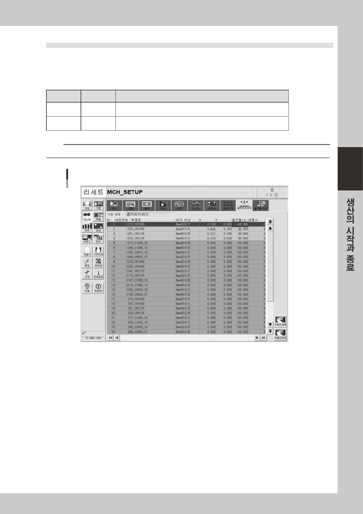 3-23 3 4 . 9 흡 착 위 치 보 정 이 화 면은 , 흡 착 위치 보 정기 능 을 사 용 하고 있 는 경 우 에 표 시됩 니 다 . 대 상 이 되는 부 품 이 어떻게 보 정되어 있는 지 확 인할 수 있 습 니다 . X , Y 방 향 어느 한 쪽 의 보 정량 이 설정 된 경 고영 역 , 에 러영역 에 들 어 간 경 우 , 실시 간 으 로 행 의 색 깔 을 바 꿔 서 표 시 합 니다 . …
