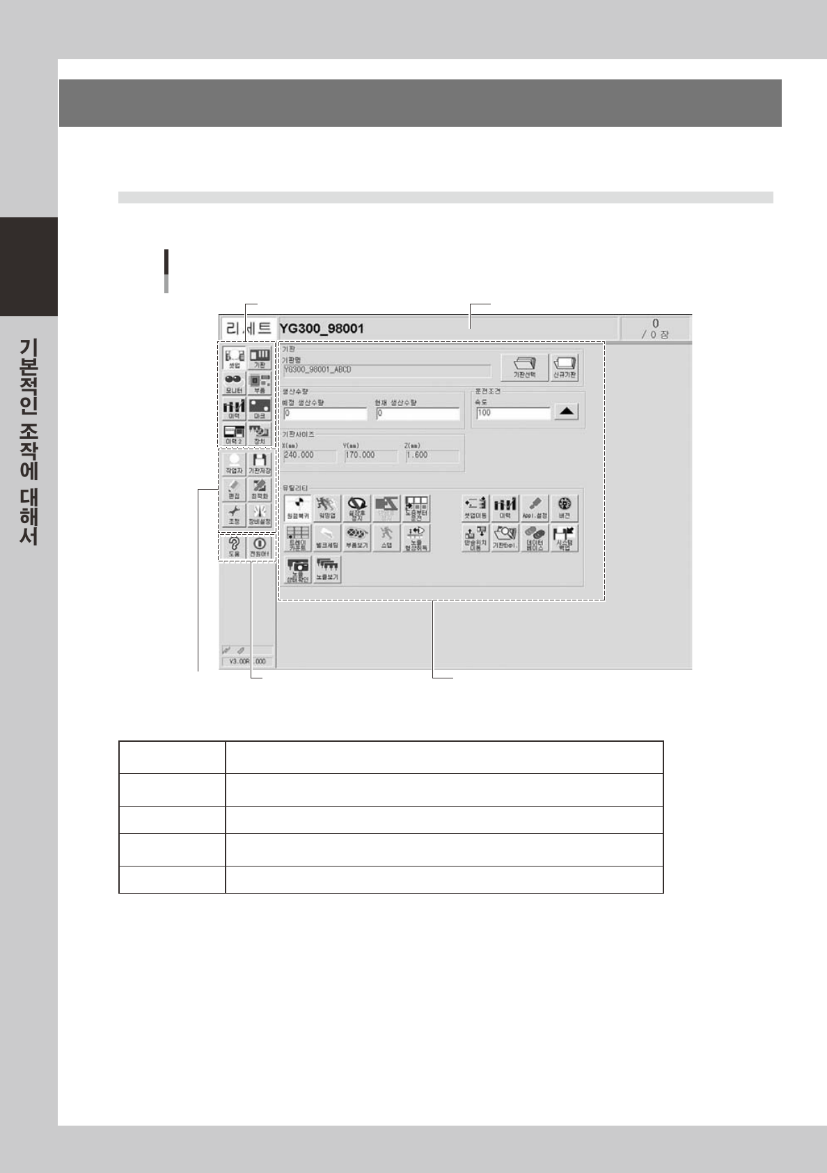 YG 시리즈의 조작화면은 , 「스테이터스 에리어」 「버튼에리어」 「프리에리어」로 구성되어 있습니다 .