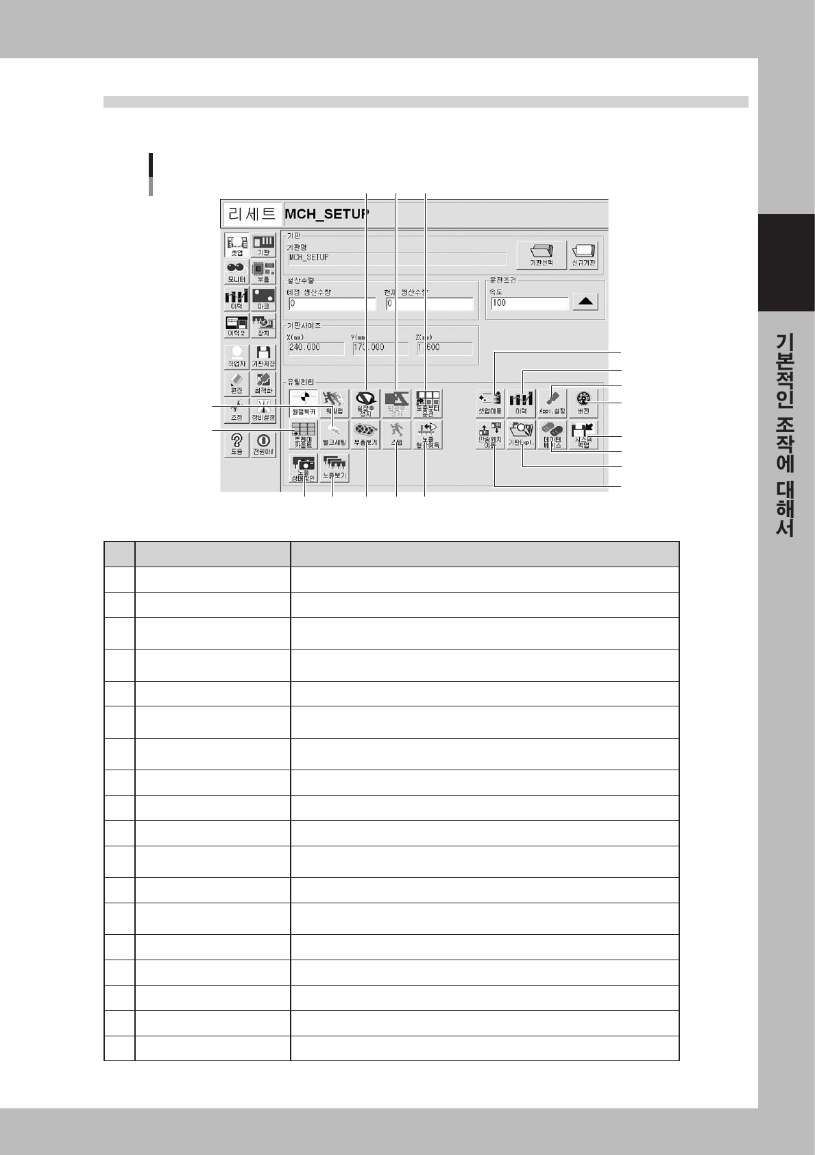 「장치」화면내의 수동조작 버튼에 관한 내용과 기능에 대해서 설명합니다 .