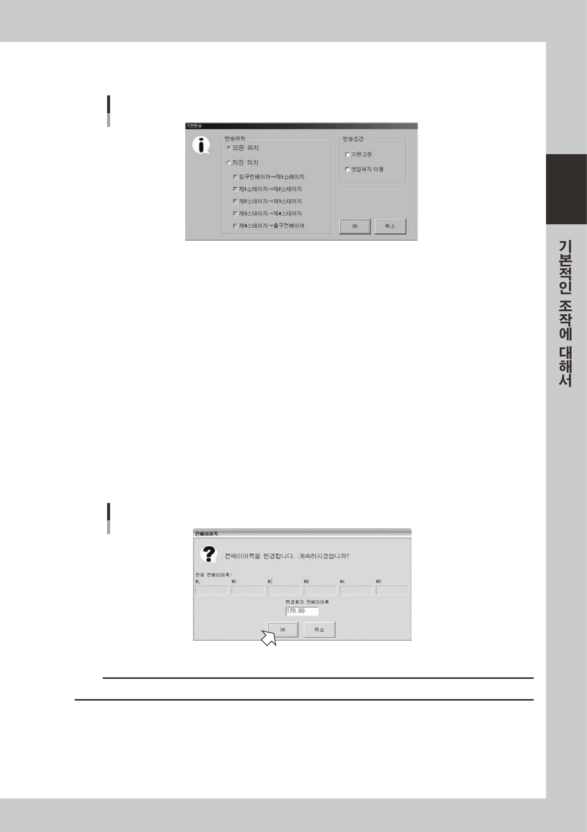 [ 컨베이어 ] 버튼을누르면컨베이어폭대화창이표시되므로 ,컨베이어폭을확인하고[OK] 버튼을눌러주십시오 .
