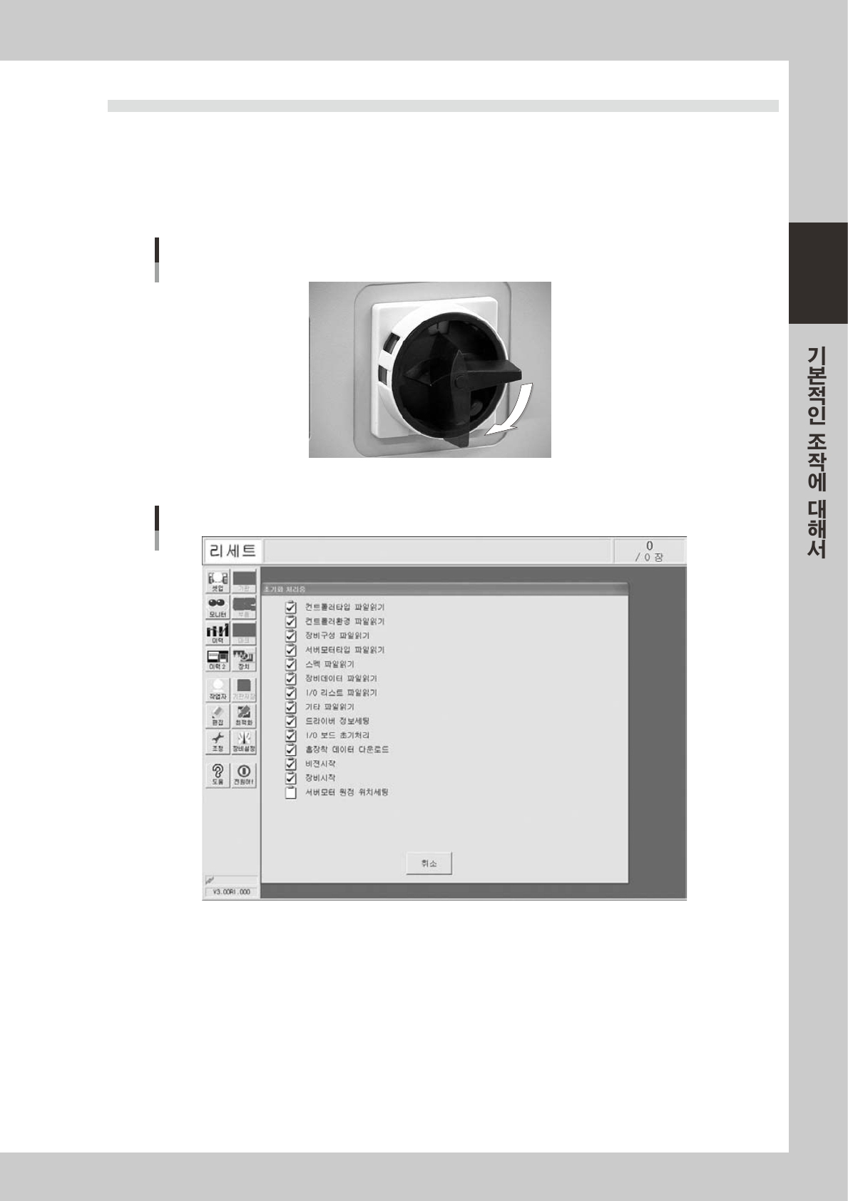 2-21 2 3 . 2 장 비 를 기 동 한 다 아 래 와 같 은 순 서로 기 계 를 가 동 시 켜 주 시기 바 랍 니다 . 1 전 원 스 위 치 를 O N 으 로 합 니 다 . 본기계 정면우 측 아 래에 있는 전원스 위치를 우 측 방 향으 로 돌 려 O N 으 로 해 주 시기 바 랍 니다 . 시스템 기동 후 , 장 비의 운 전 에 필요한…