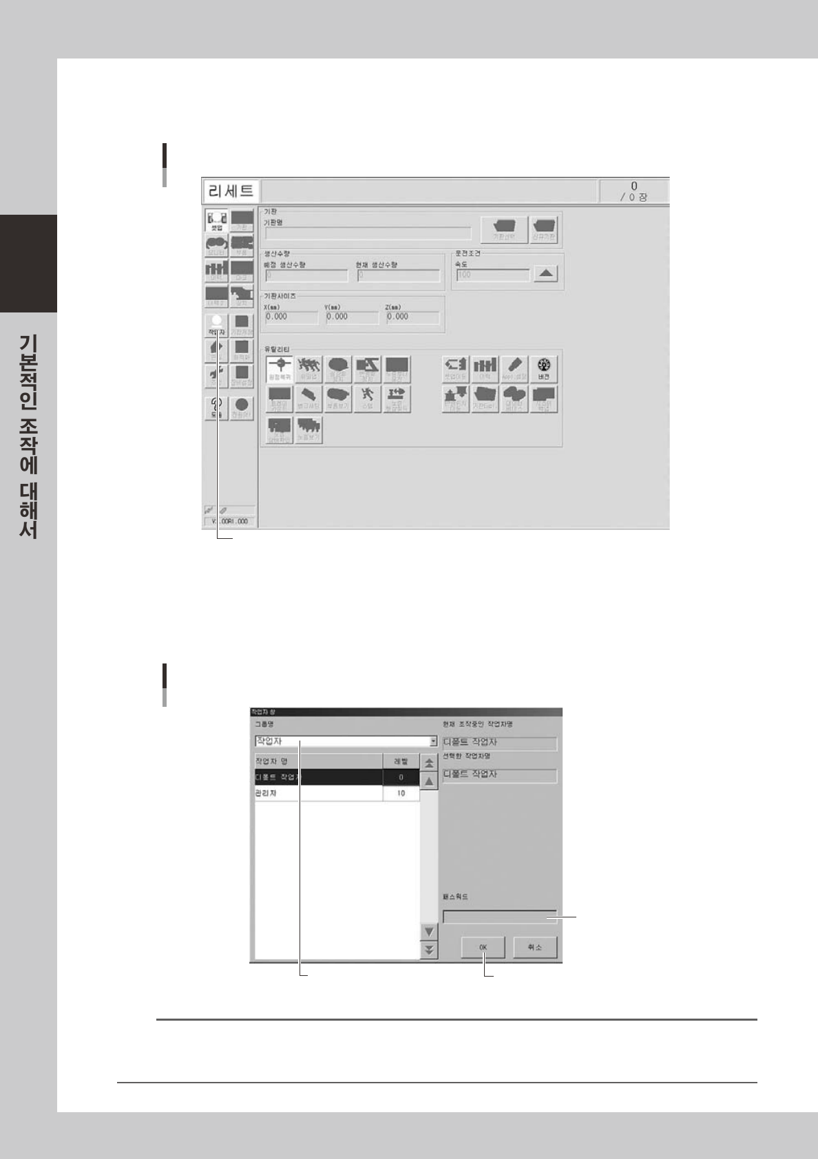 고 패스워드와 조작레벨의 설정에 따라 작업자의 추가 , 조작허가 항목의 설정이 가능합니다 .