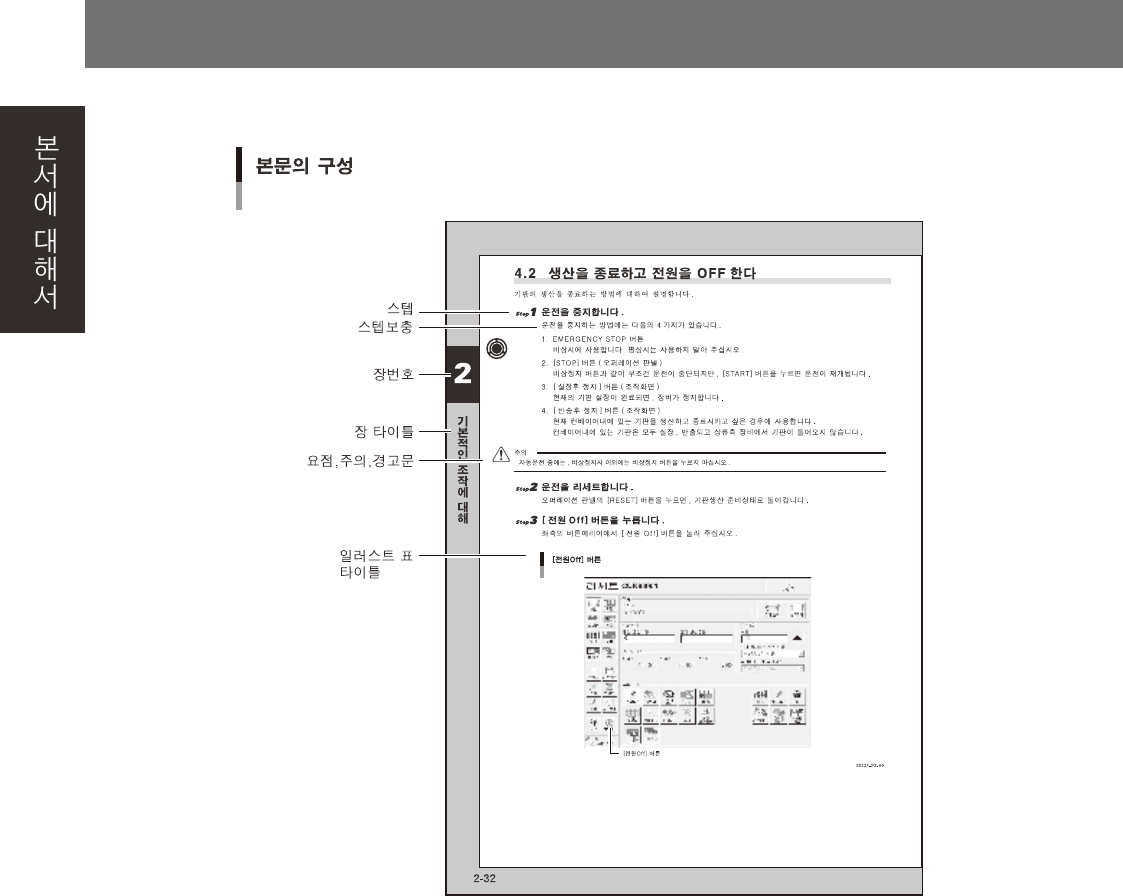 iii 2 . 각 장 의 내 용 본 서는 아 래와 같은 장 으 로 구 성되어 있습 니다 . 본 서에 대 해 서 안 전 의 길 잡 이 기계 의 사 용 상 안 전 에 관 한 중요한 내용 을 설명합 니 다 . 제 1 장 각 부 의 명 칭 과 기 능 각부 의 명 칭과 기능 등 , 조 작 을 시작 하기 전 에 알 아 두 어야 …
