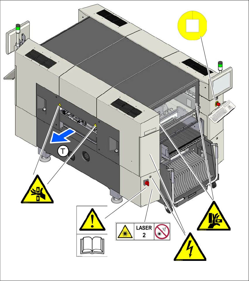 2 Käyttöturvallisuus Käyttöohje SIPLACE SX1/SX2 2.2 Varoituskyltit Ohjelmistoversiosta SR.710.0 alkaen Painos 12/2016 40 Kuva 2.2 - 2 Automaattiin kiinnitetyt varoituskyltit - p aikoituspaikk a 1 Merkki W201, tuotenro 03…