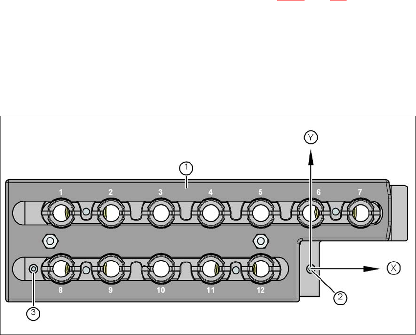 Kuva 6.1 - 9 Pipettimakasiini - paikkanumerointi, kohdistusmerkit sijainnin ja kulmasuunnan määrittämiseen
