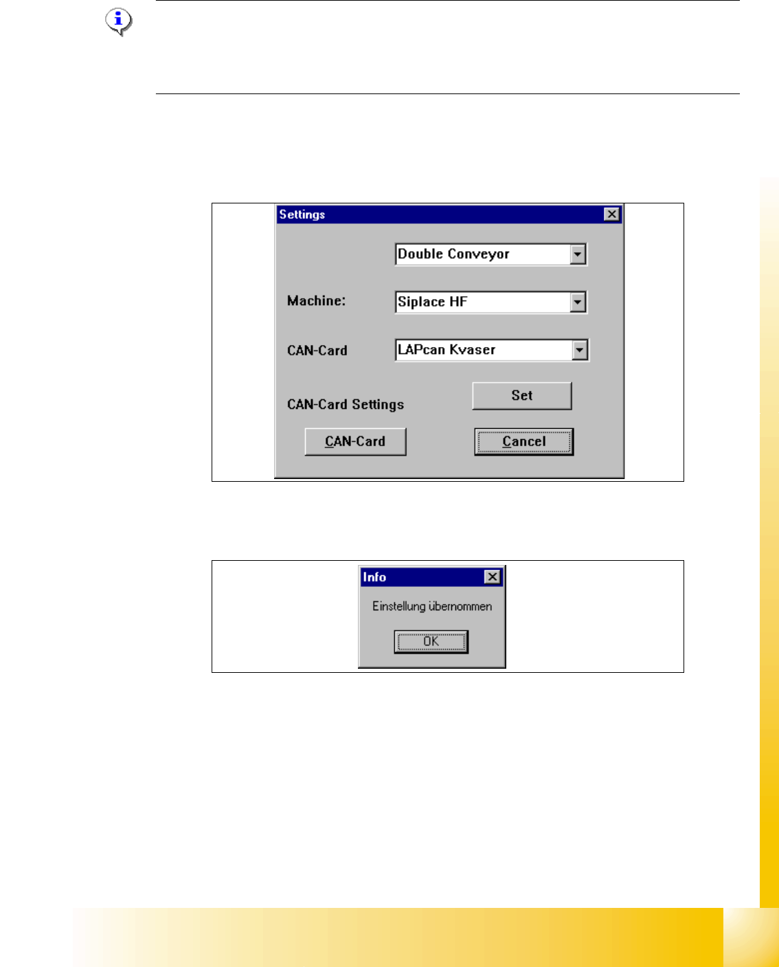 ➠ Define the conveyor type, machine type (HS 60,S27 HM, HF, X) under "Settings".