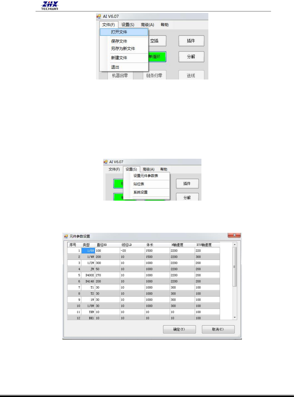 ZHX-A30C& D-AS(I N) 自动卧式联 体插件机操作 说明书 深圳市中禾 旭精密机械有 限公司 http:// www .z kdip.com - 14 - H 速度: 插件轴 H 的速度。 XYU 速度: 工作 台和 U 轴移动的速度。 确定: 保存 修改好的参数 并应用。 取消: 退出 当前,返回上 一级操作系统 界面。 (2)系统设置: 1>参数 机器的所有 参数调整都在 系统设置里进 行,包括 相机位置…