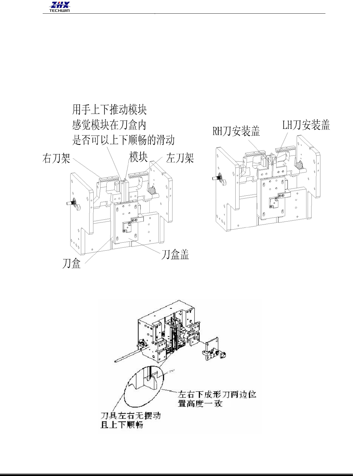 其与丝杆配件 1、刀架的导刀槽贴合在一起,把 RH 刀安装盖、LH 刀安装盖装上并锁