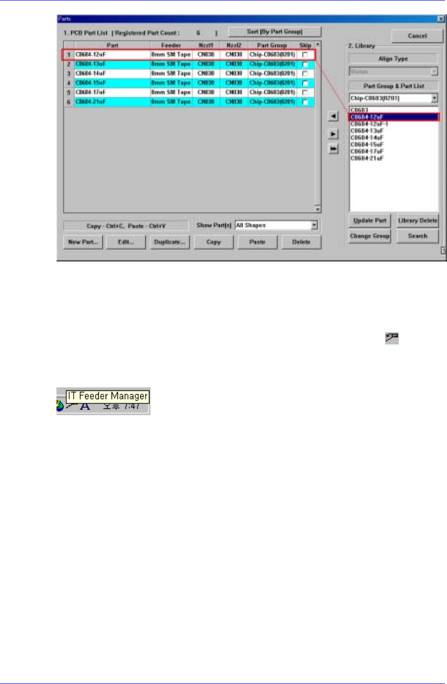 Displays information on the feeder programmed in the PCB program and parts, and real