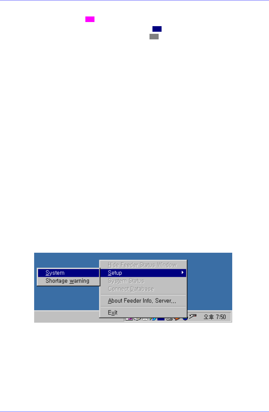 IT Feeder System 1-7 Front feederbase Rear feederbase statu s des cripti on Programm ed feeder & p art Actu al feeder & p art Feed er status Figur e 1-7. FIS main window 1.4.1.1. Feeder S tatus Displays real time…