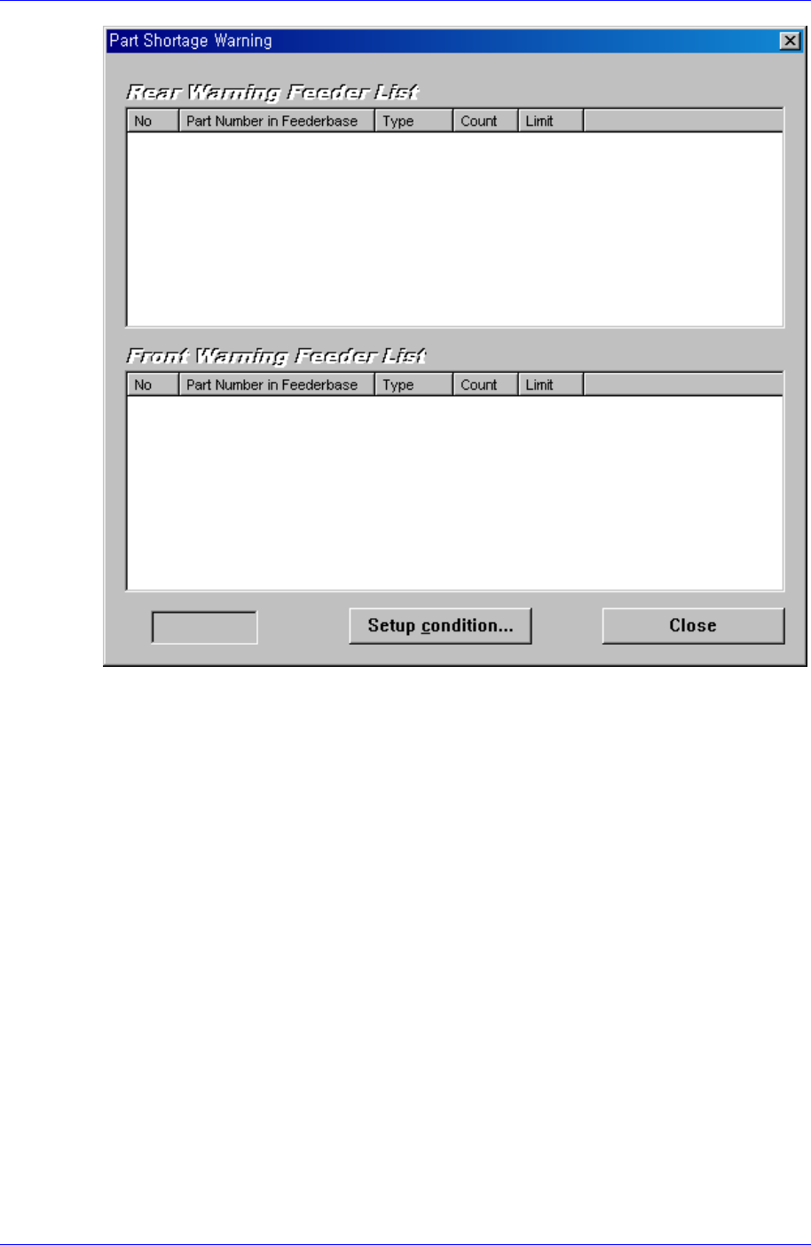 IT Feeder System 1-15 Figur e 1-17. Setup Part Shor tage W arni ng dialog box <Enable warning> check box Check whether to use the part short warni ng or not. When it is checked and the part count drops belo…