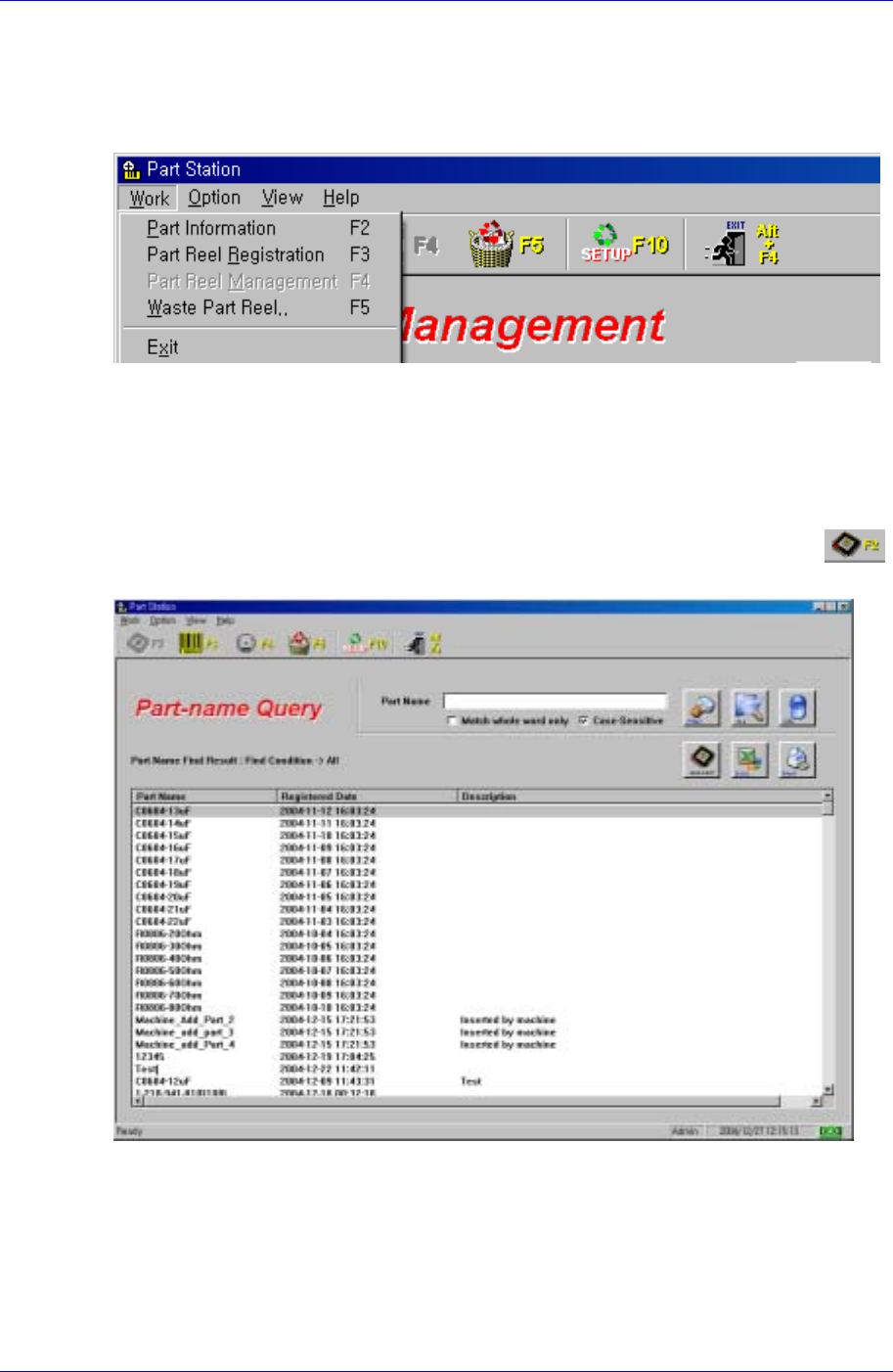 Part S tation 2-5 2.3. Work When the W ork Menu is selected on the Main menu bar , the following sub menus appear . The W ork menu consists of 5 submenus; Part Information, Part Reel Registration, Part Reel Management, W…