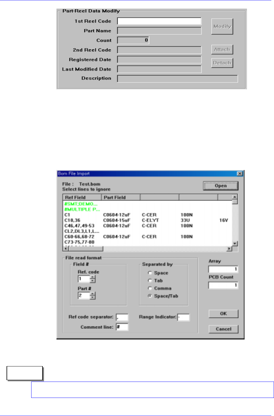 Part S tation 2-1 1 Figur e 2-9.Part Reel D ata Query and M odify wi ndow ReelAll searching Searches all registered reel data. Bom File searching When inquiring with the Bom File, the Bom File Import window (see Figu…