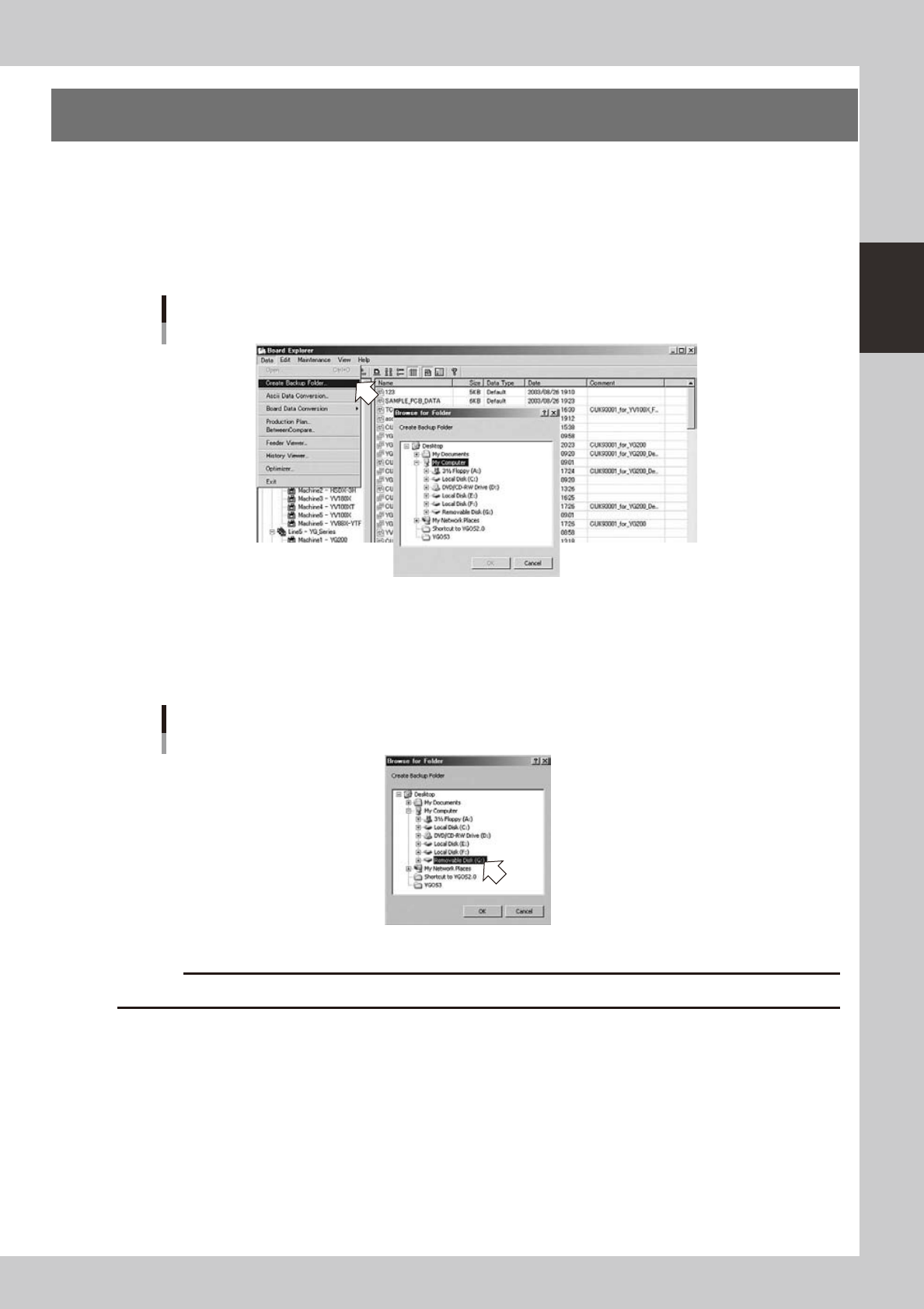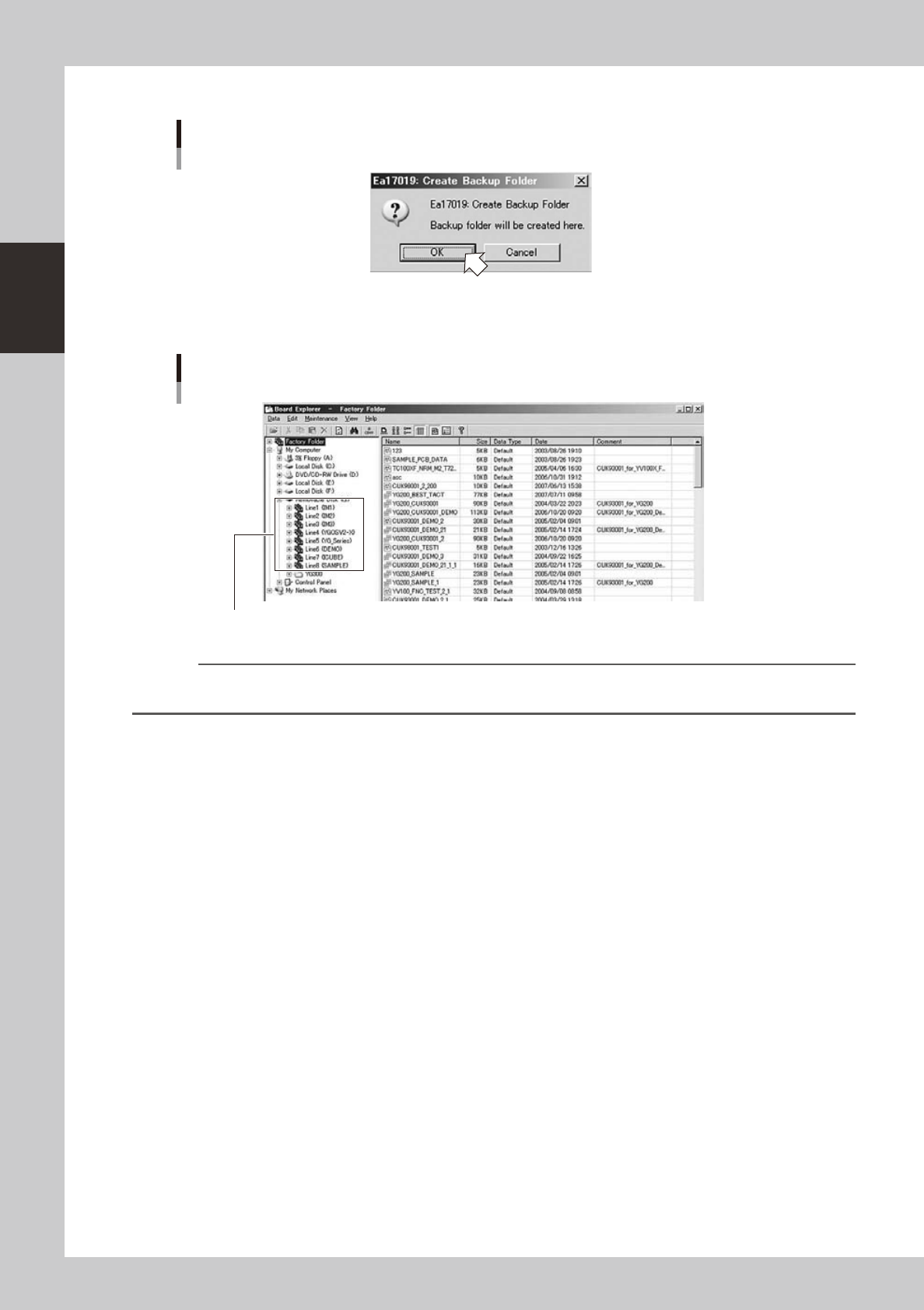2-69 2 Board Explorer 7. Creating the backup folders The Factor y T ools allows you to create backup folders under any desired director y to back up board data. T o create backup folders, follow these steps. 1 Start the …