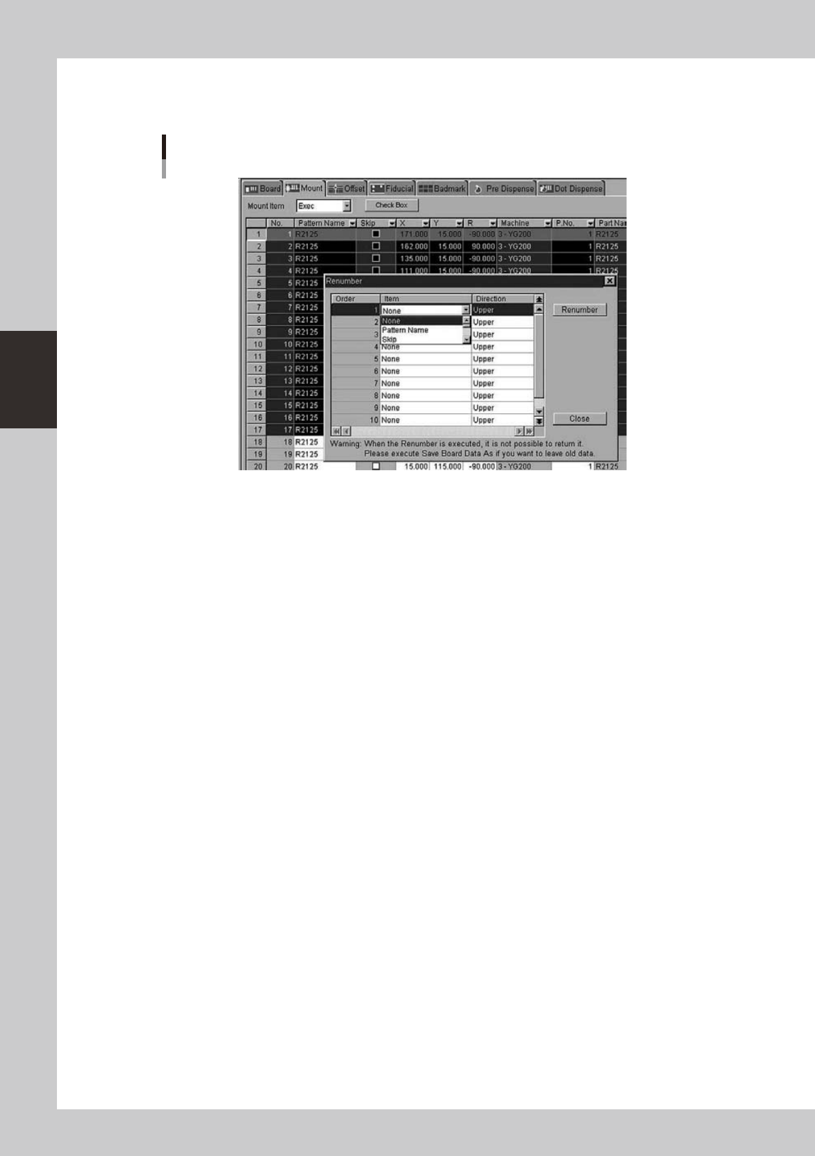 3-40 3 Board Editor n Renumber of selection line WhenyouexecuteRenumberasfollowsfortheselectionline,Renumberisexecutedintheselectionline. Renumber of selection line 64369-S0-00 n Restriction matter • Thi…