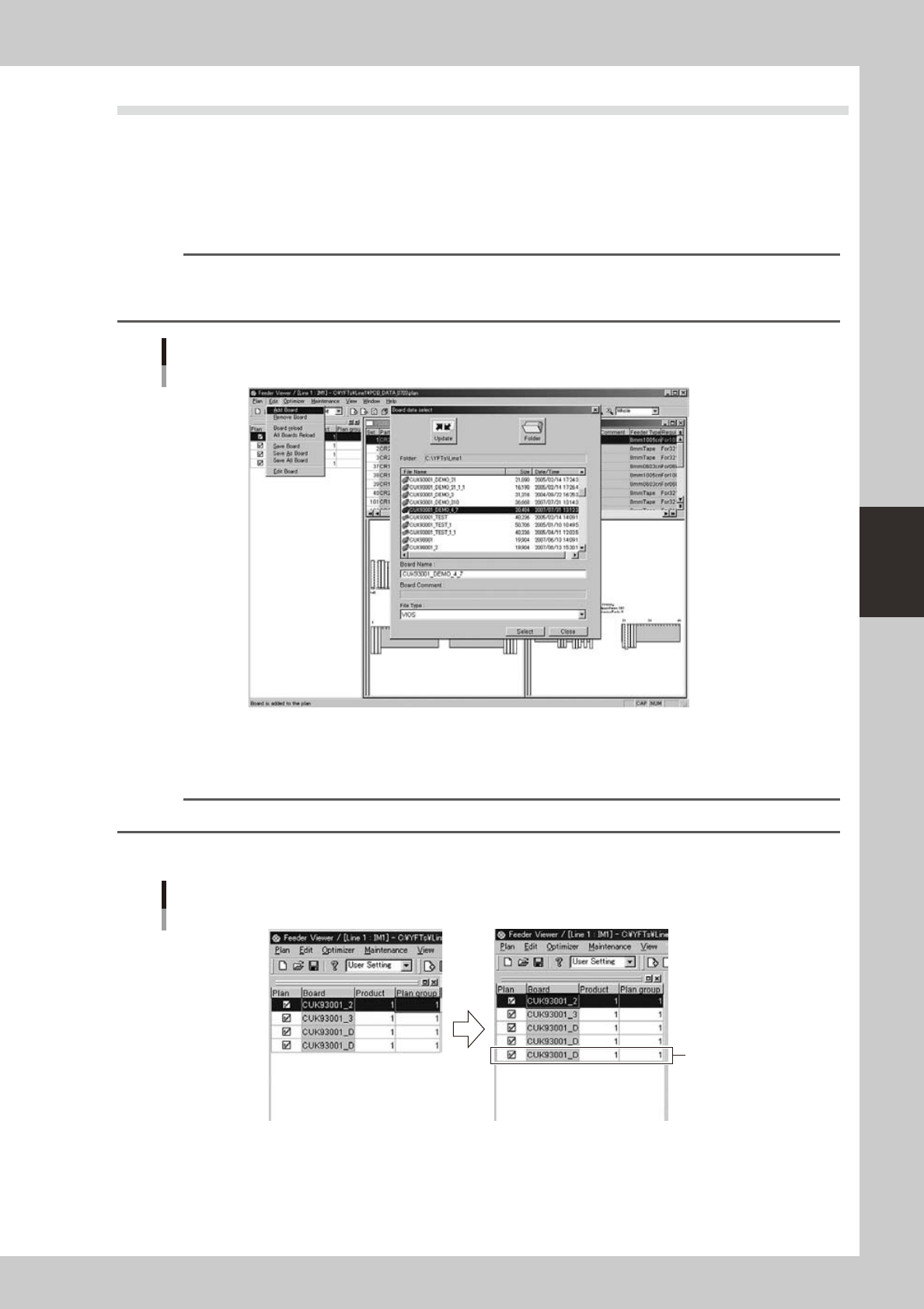 4-24 4 Feeder Viewer 3.2.2 Deleting board data 1 Select the board data you w ant to delete. From the production board lis t in the left pane, select the board name you want to delete. Reference Clicking the [Remove Board…