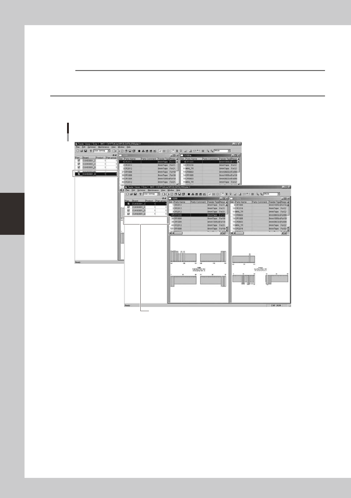 4-25 4 Feeder Viewer 3.3 Changing the order of board data You can change the order in which board data is displayed on the production board list, or sort board data by production count (number of boards to produce) or gr…