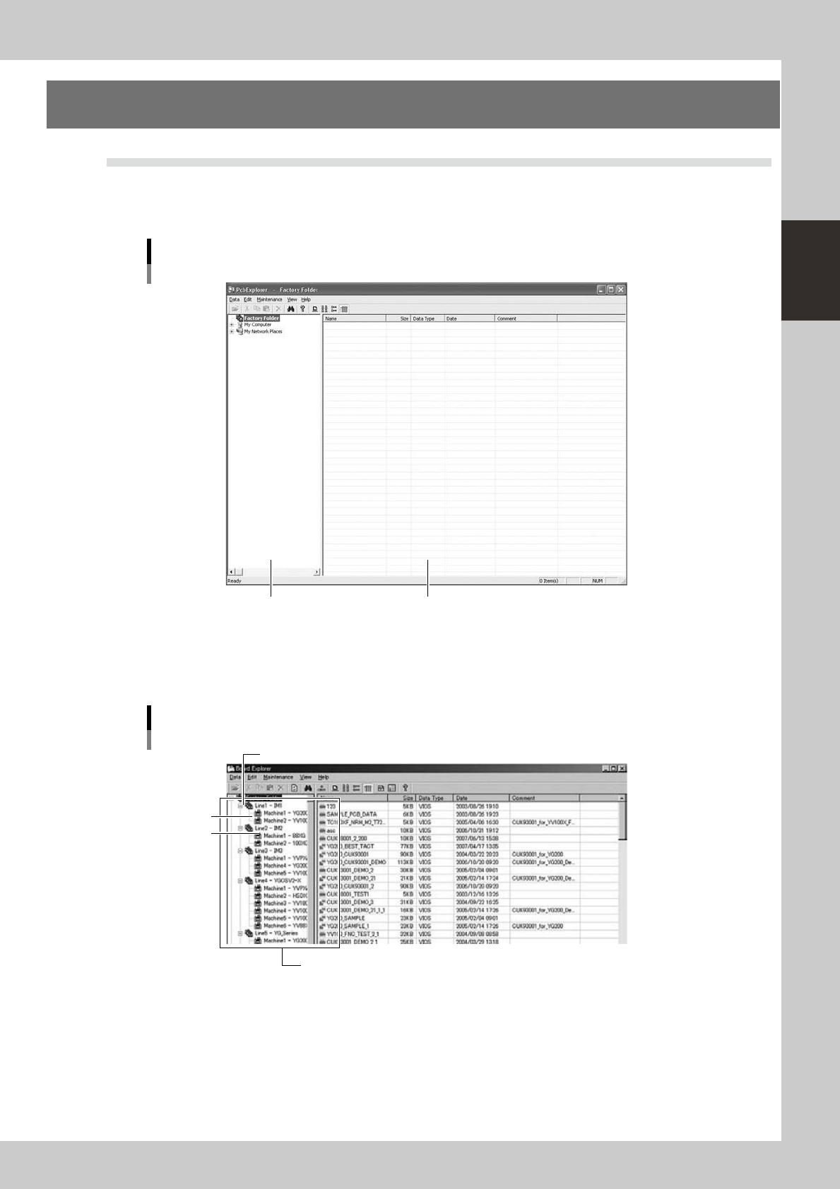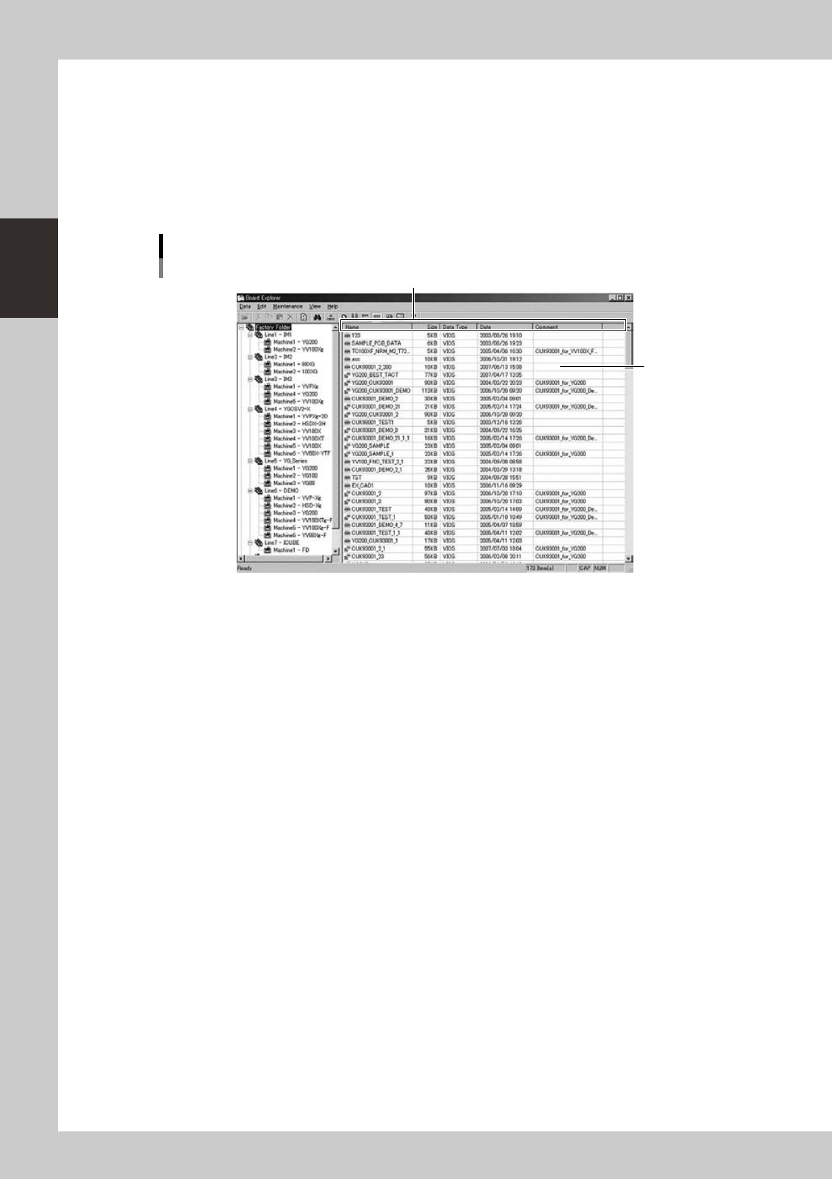 2-3 2 Board Explorer 2. Basic operation 2.1 About the Board Explorer WhentheBoardExplorerstartsup,youwillseeawindowdividedintotwopanesasshownbelow.Theleft pane is the tree view showing “Factory Folder…