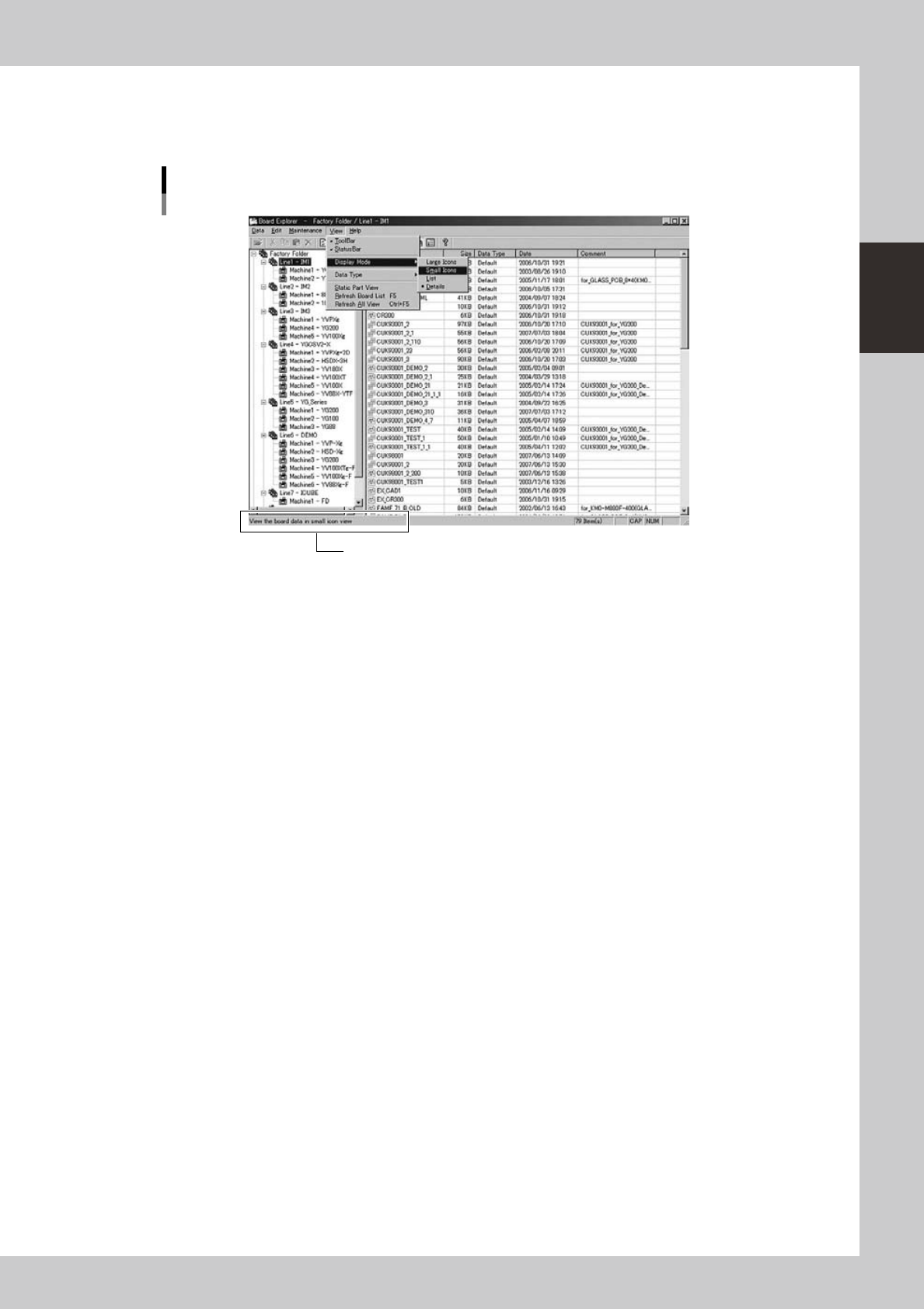 2-12 2 Board Explorer 3. Registering or deleting “lines” and “machines” When using the Board Editor of the Factor y T ools to edit Board data or optimize data, you must register “machines” connected with a “line”. This s…