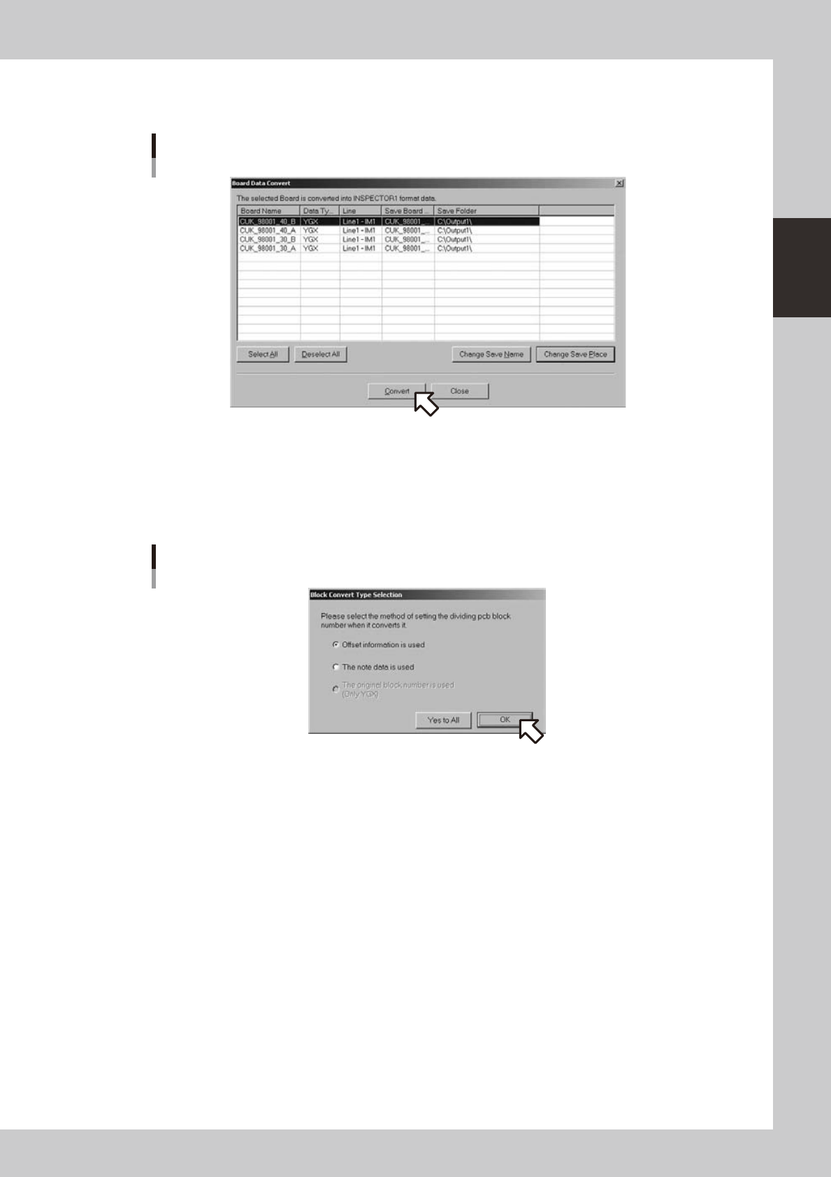 When you click the [All Yes] button, subsequent board data will be converted in the same setting. No