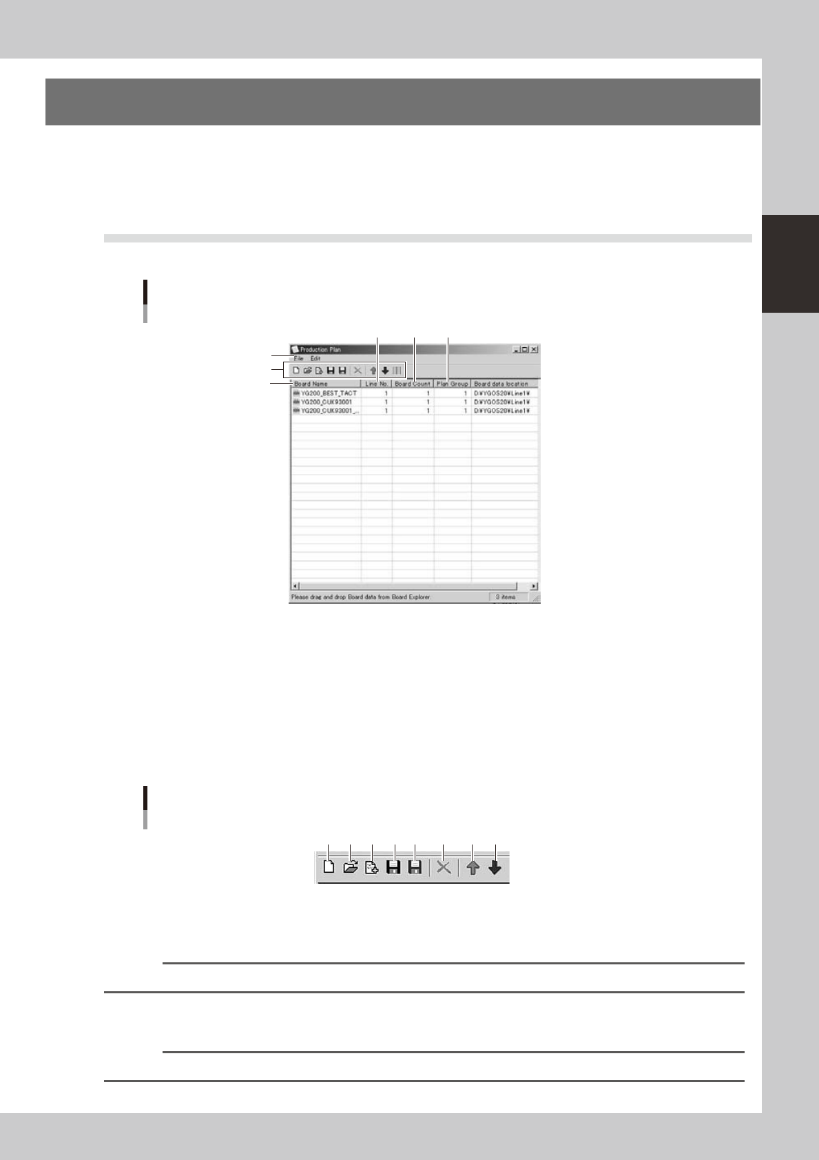 2-65 2 Board Explorer 6. Creating a production plan (plan file) When manufacturing boards of different types continuously , you may want to create a file called “plan file” in which two or more board types and their prod…