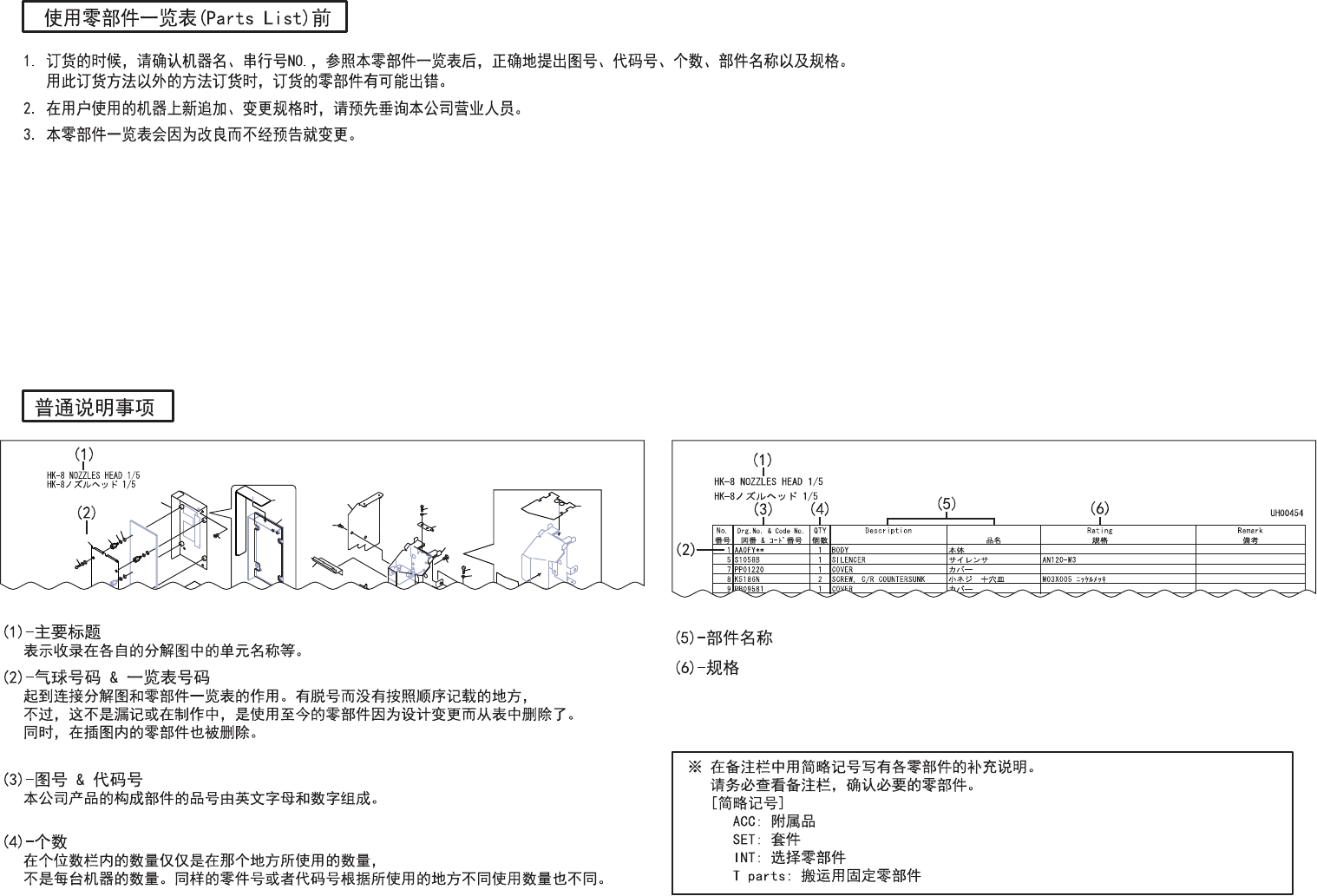 1. When ordering parts, check the machine name and serial number and then refer to this part list for the correct drawing number,