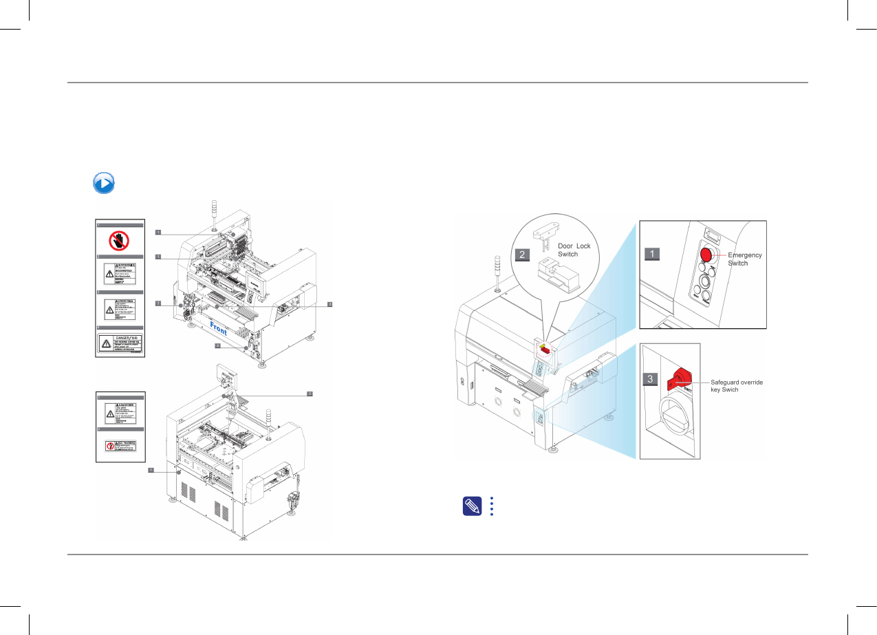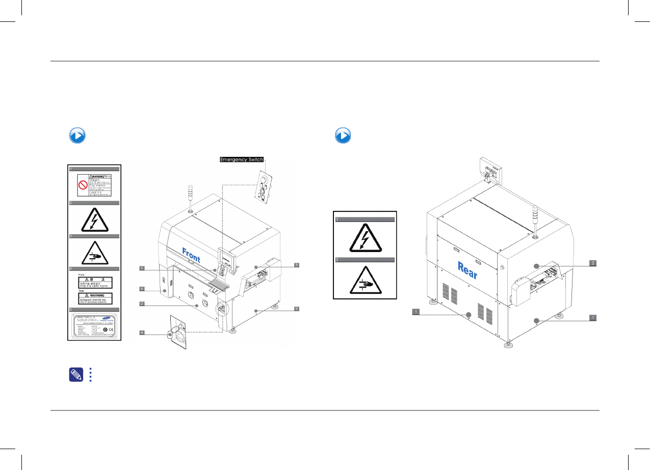 为了安全地使用设备、在下列位置粘贴了安全提示标签。 在紧急状况下立刻停止设备运转。
