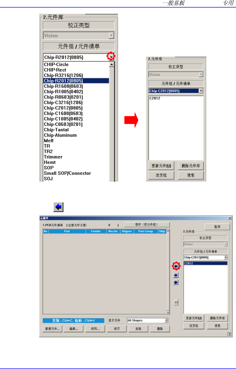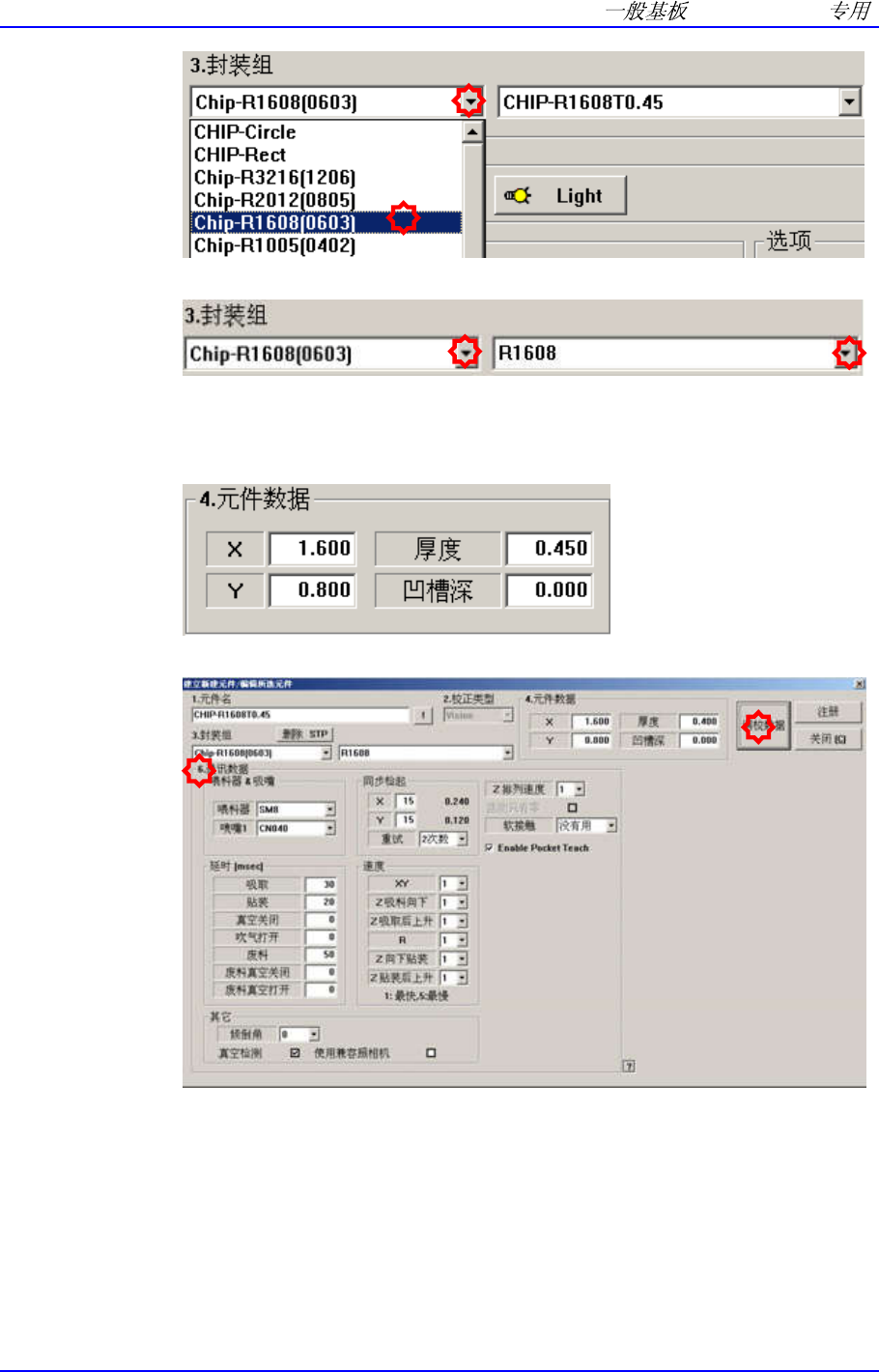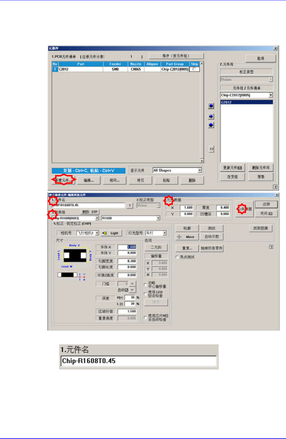 Samsung Component Pla cer SM421 Pr ogramming T utorial 1.3.2.2. 新元件的登 记 ( 登 记 新元件后作 业时 ) Chip (Resistor 160 8,0.45t, 8mm,CN040, CN065) 登记 单击位于屏幕左下角的 < 新建元件 …> 按钮。 输入 <1. 元件 名 > 。 ( 请输入 Chip-R1608T0.45) …
