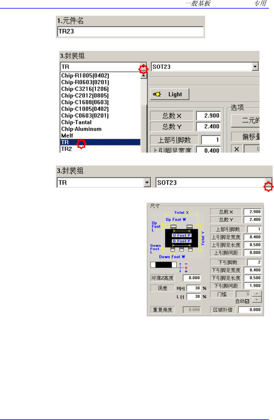 Pr ogram(Chip ) 1-19 在 <3. 封装组 > Grou p 选择 TR 。 在 <3. 封装组 > Profil e 选择 SOT23 。 输入元件的大小。 Align Data T otal X: 2.9 , Y : 2.4 Up Group 输入 Up Lead Number: 1 Foot W : 0.4 Foot L: 0.5 Lead P: 0.0 …