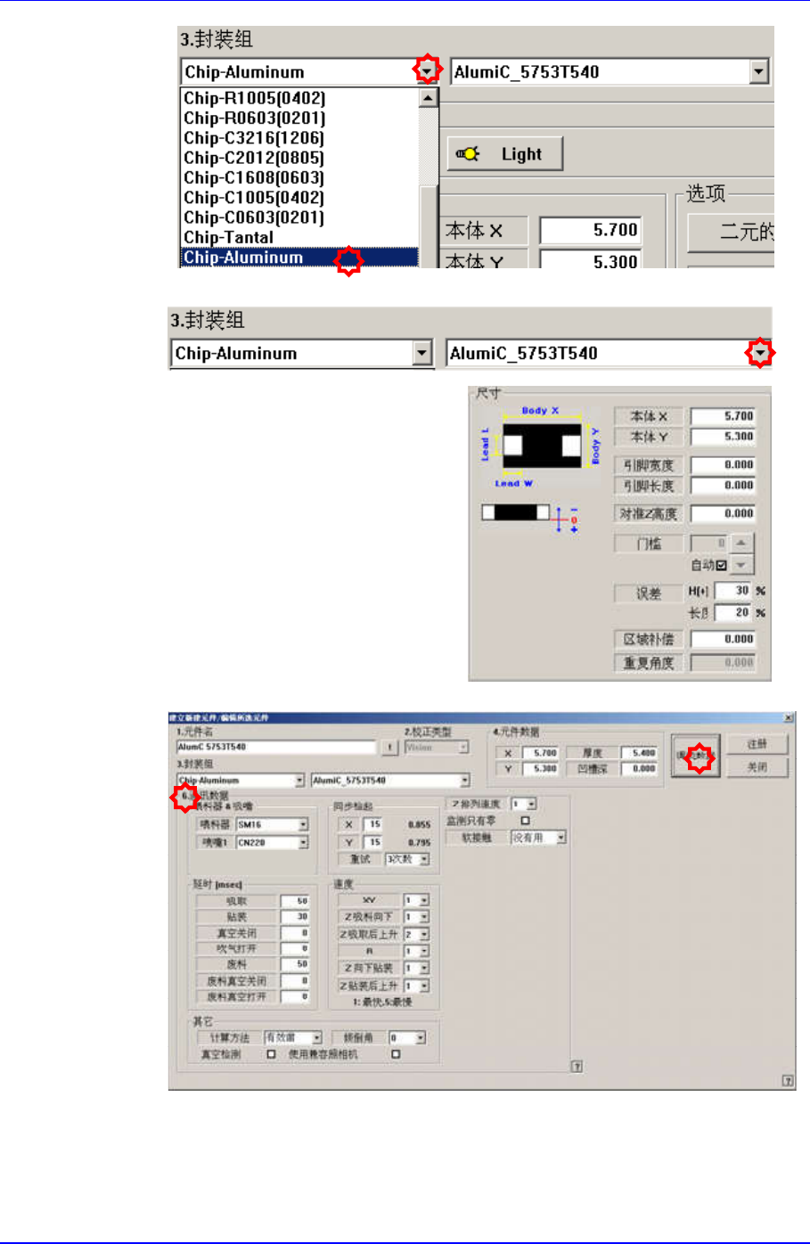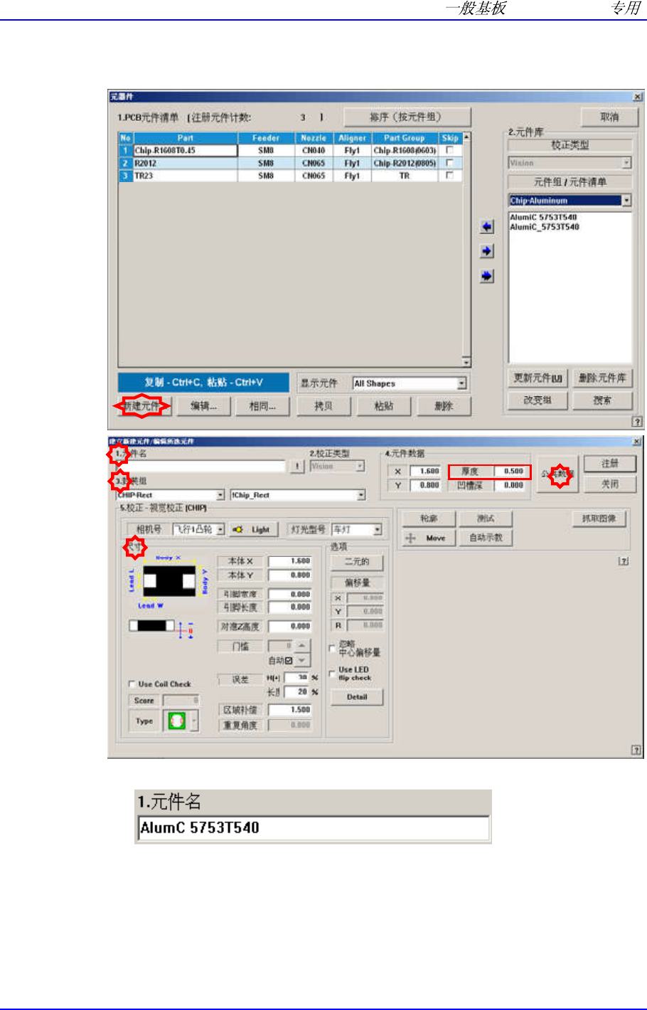 Pr ogram(Chip ) 1-21 A/C ( 铝电容器 ) 单击位于屏幕左下角的 < 新建元件 …> 按钮。 输入 <1. 元件名 > 。 (AlumC 5753T5 40) 在 <3. 封装组 > Group 选择 Chip-Aluminum 。