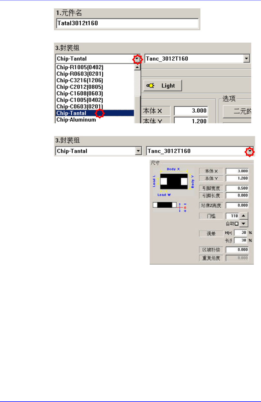 Samsung Component Pla cer SM421 Pr ogramming T utorial 在 <3. 封装组 > Group 选择 Chip-T antal 。 在 <3. 封装组 > Profile 选择 Tnac_3012T160 。 输入元件的 大小。 Align Data X: 3.0, Y : 1.2 Lead W : 1.2, Lead L: 0.5 …