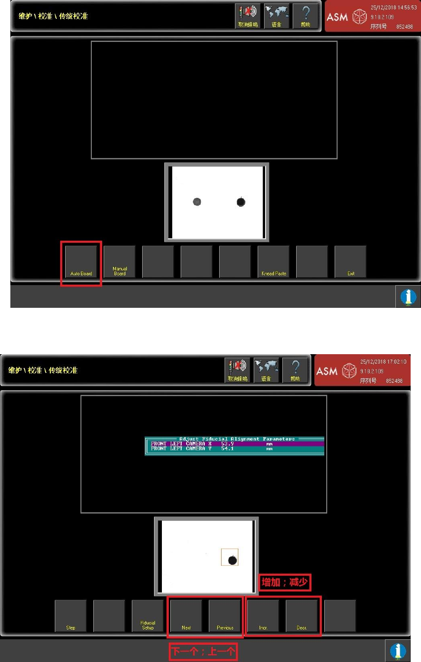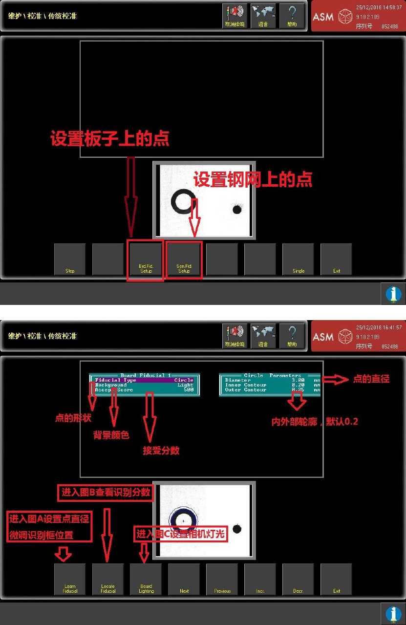2-8 到此画面机器将识别钢网和板子上的一对点,Scn.Fid Setup 设置钢网点的识别参数,Bid.Fid Setup 设置板子