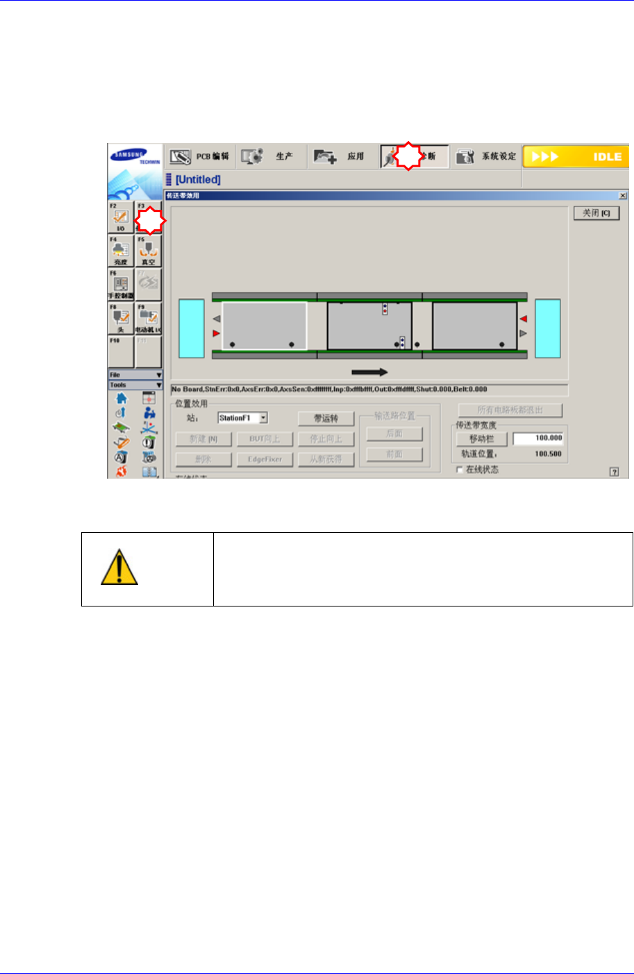 2. 在’Conveyor Utilities’对话框中投入 Test PCB,确认各 Station 的基板检查传感器