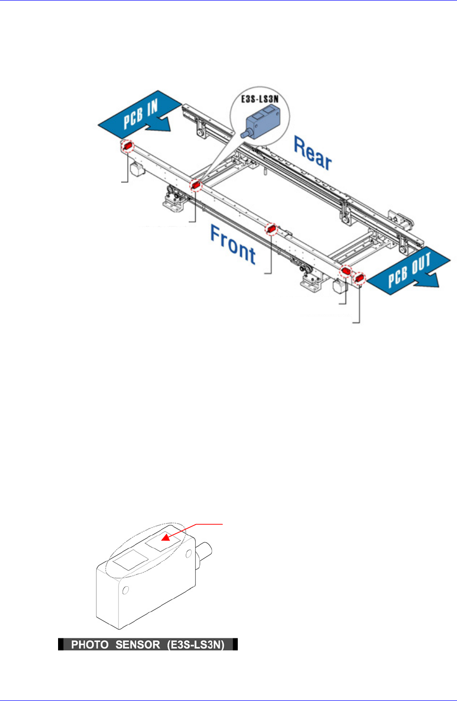 传送装置(Conveyor)PCB输入/输出路径上安装了4PCB的感应传感器。