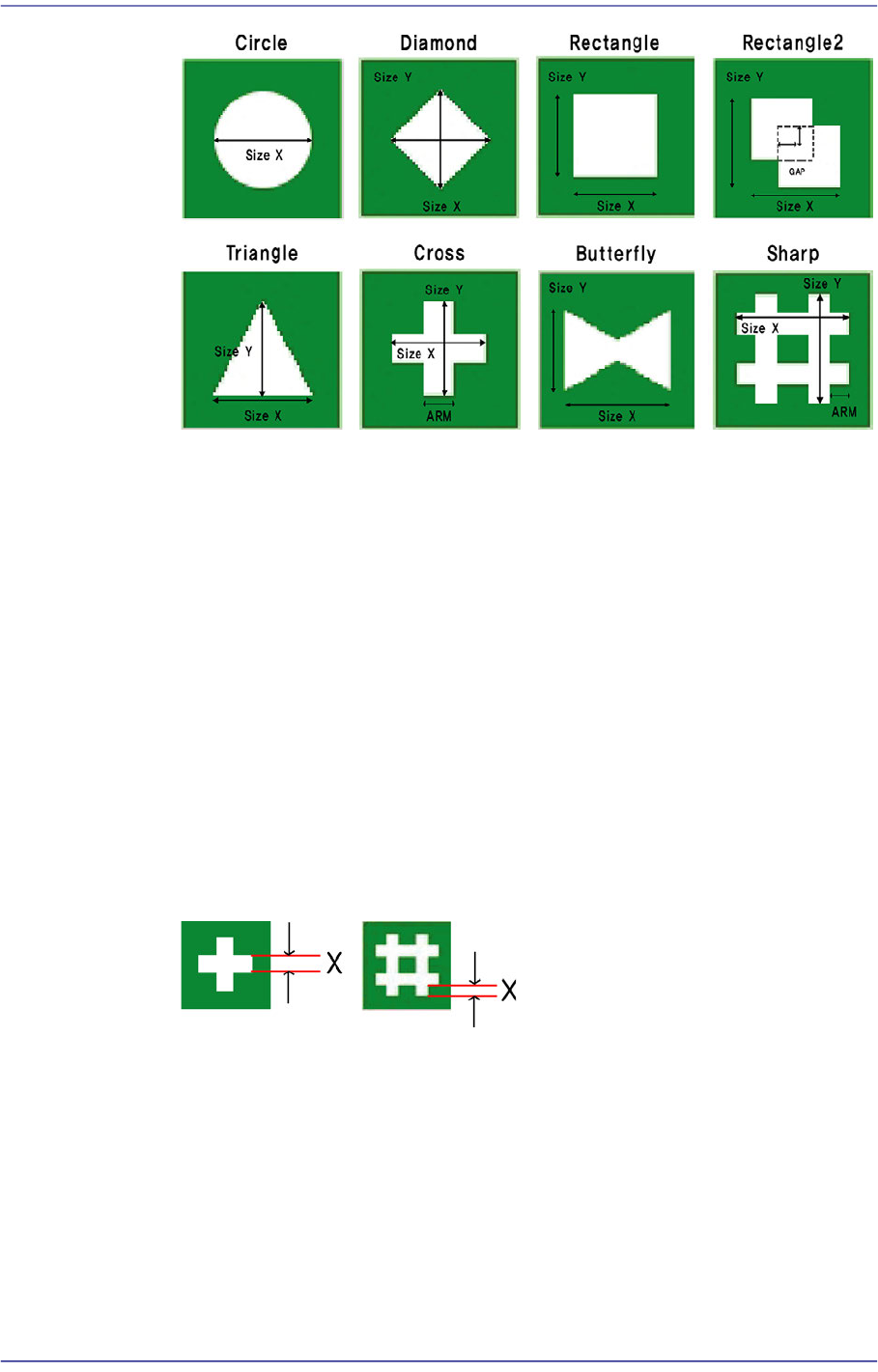 6-21 Board 定义 <PKG> 检查框 识别荧光材料基准标记时选择。 <6. 形状数据 > 领域 它是有关基准标记形状的数据。 < 尺寸 X> 编辑框 设定基准标记的 X 轴方向尺 寸 。 (以设备的坐标系为准) < 尺寸 Y> 编辑框 设定基准标记的 Y 轴方向尺 寸 。 (以设备的坐标系为准) <Arm> 编辑框 设定十字形基准标记的横竖条的宽度…