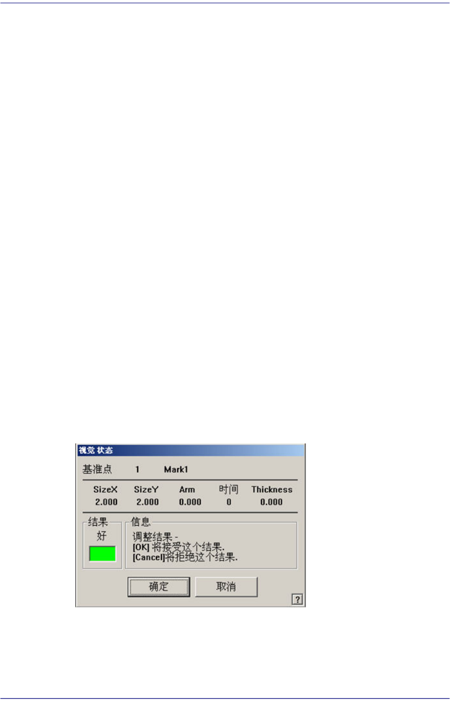 6-24 Next Generation, Multi-Function al Placer DECAN S1 Administrator’s Guide < 测试 > 按钮 利用已设定的标记的数据检查标记。 通过它可以确认设定值是否正 确。 成功地 结束检查后显示以下的信息框。 检 查失败时, 显示以下的 信息框。 < 扫描 > 按钮 进行对已设定的基准标记的扫描测试。 扫描测试 利用已设定的基准标记的…