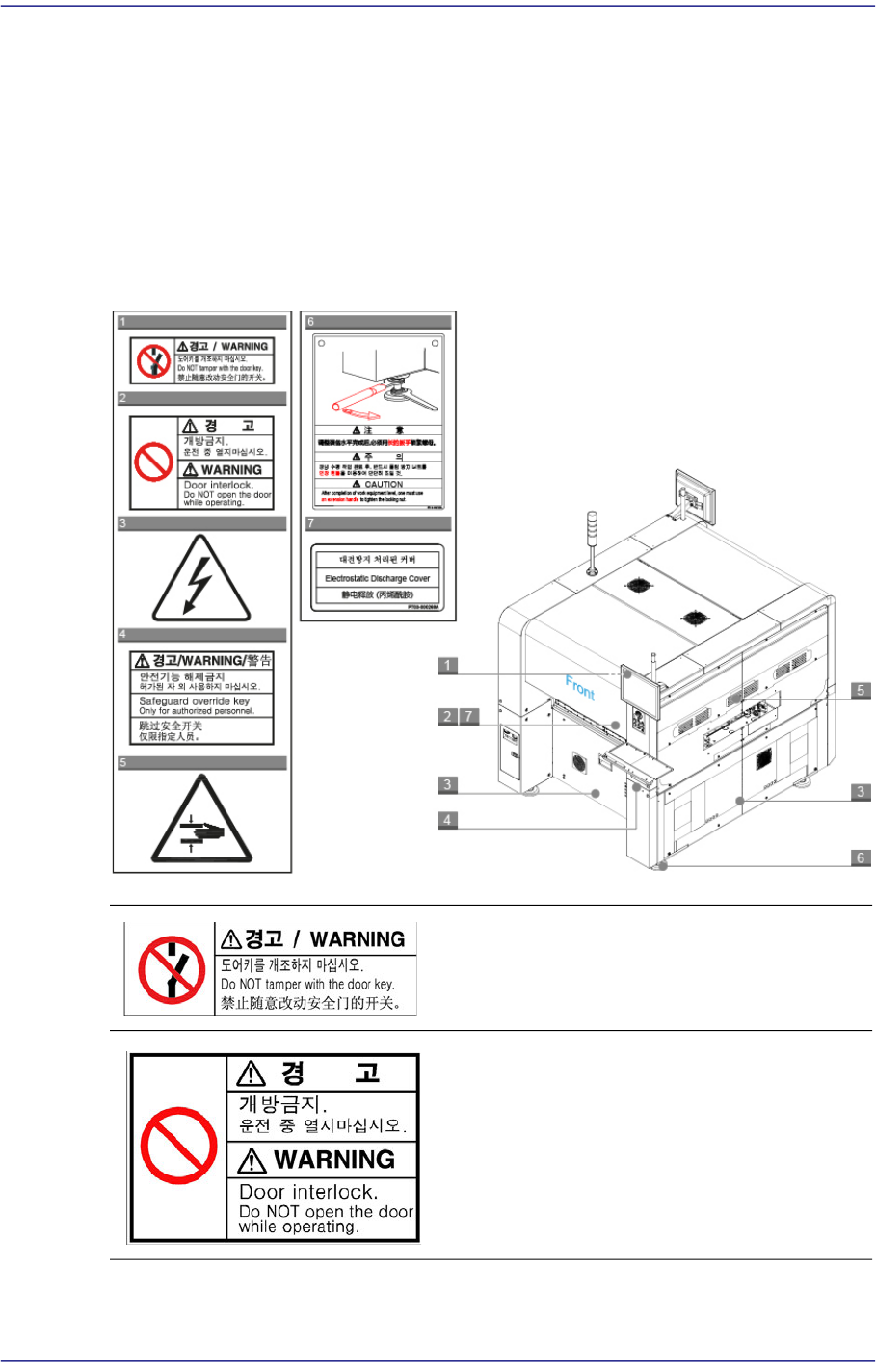 前言 iii 安全注意事項 ( Safety Precautio n) 以下各节的标签贴在指定的位置上。 为了安全使用设备请遵守各标签的指示事项。 标签脱落或损伤时请参考相应图解在指定的位置上粘贴新标签。 有关标签订购或改 善及建议事项请咨询本公司的 CS 公司或当地代理店。 设备前面 设备前面贴有以下标签 图 1.1 设备前面贴有以下标签 不要改造门钥匙。 不要擅自改造门钥匙。 否则会危害到安全。 运行中请勿打开门 贴有此标签处有…
