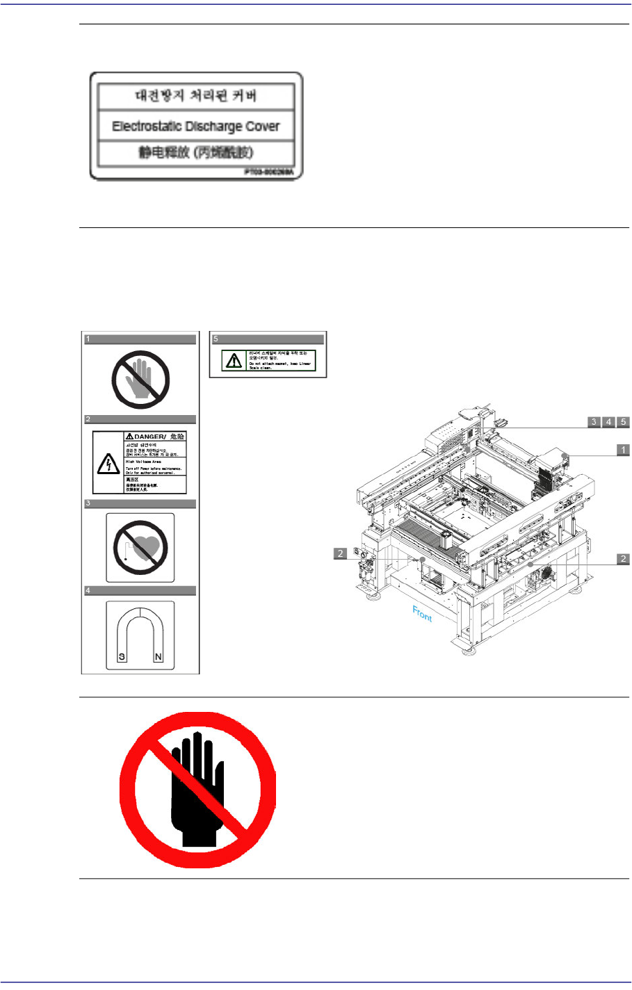 Next Generation, Multi-Function al Placer DECAN S1 Administrator’s Guide vi 运行中请勿打开门 贴有此标签处有移动体, 驱 动中打开门把身 体的一部份伸进设备内部时非常危险。 设备出货时电源被设定为 AC 380V 。 为设备 供应电源之前, 必须确认所供应的电源与设 备的电源设定是否符合。 维修前确认 维修前请除去空气管。 盖内侧及周围连接物部位存在高电压要注意…