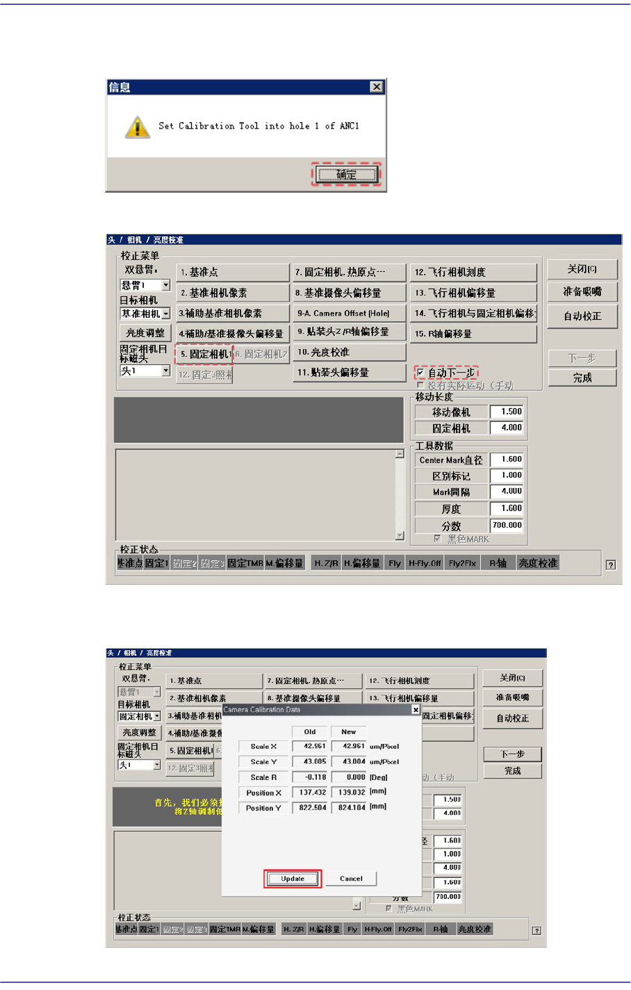 14-44 Next Generation, Multi-Function al Placer DECAN S1 Administrator’s G uide 4. 将显示 “Set Calibration T ool into hole 1 of ANC1” 信息。 在 ANC 1 的 1 号孔上安装 CNT20 喷嘴后, 点击 < 确认 > 按钮。 5. 选择 <Automatic Next> 校验盒后 , …