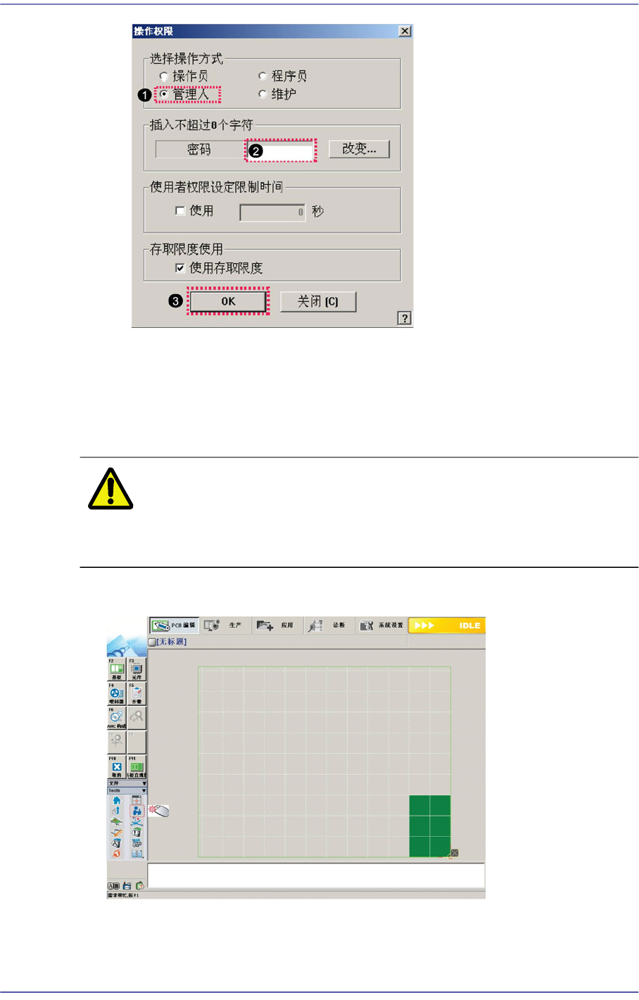 注 意 请勿与其他用户共享程序员方式及管理员方式的密码。 无权限