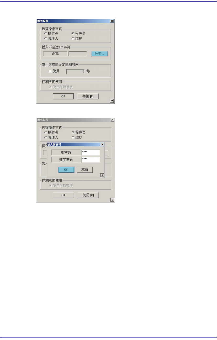 1-9 操作方式及修改密码 请点击 ’ 操作方式 ’ 图标按钮。 则显示如下对话框。 请点击 < 改变 … > 按钮。 则显示如下对话框。 在 < 新密码 > 编辑框输入拟设置的密码。 在 < 证实密码 > 编辑框上重新输入所设置的密码以便确认。 然后单击 < 确定 > 按钮, 即可 适 用该修改内容。