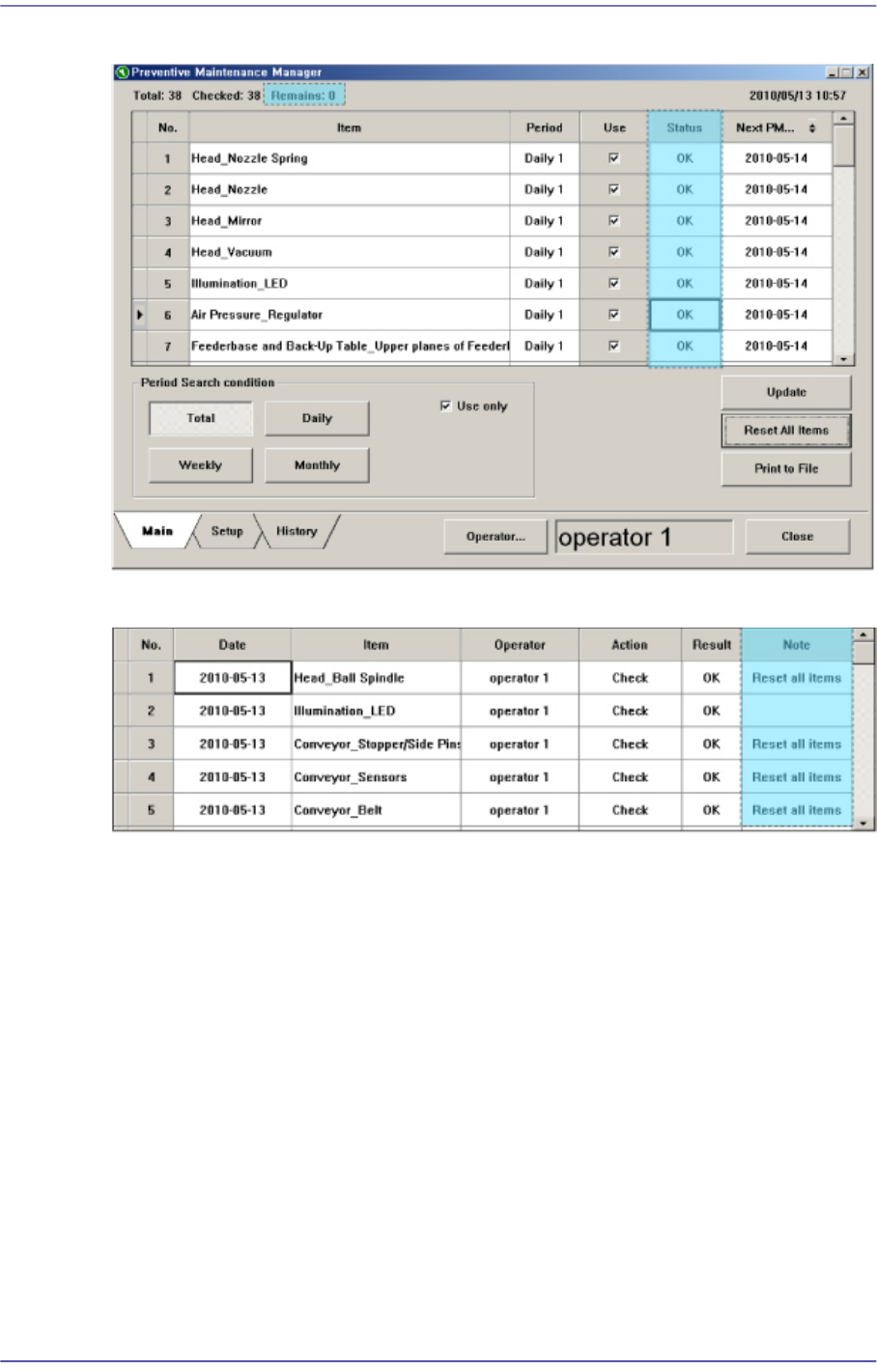 19-7 PM Manager 图 19.6 History 中查看检查措施内容 19.4.6. 所有的查项目变更为检查完成 ( “OK”) 状态 所有的检查项目可以一次性改变为已完成检查的状态。 方法如下。 点击 <Reset All Items> 按钮 出现 PMManager 对话框时点 击 < 是 (Y)> 按钮。 如上进行设置时 Main 画面的所有项目改变为检查完成的状态的同时需要检查的项 目…