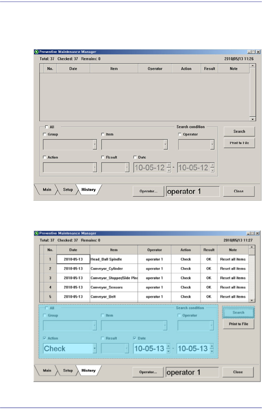 19-16 Next Generation, Multi-Function al Placer DECAN S1 Administrator’s Guide 19.6. History 画面 在 History 画面中可查 看所有检查记录。 图 19.14 History 画面 查看检查记录时, 输 入检查条件后点击 <Search> 按钮。 图 19.15 检查记录查看画面
