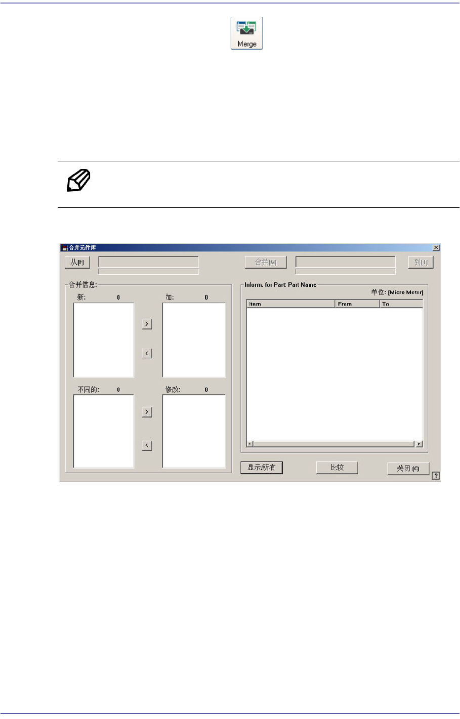 比较两个DB文件在<合并信息>领域Target DB文件中没有的部件信息显示在<