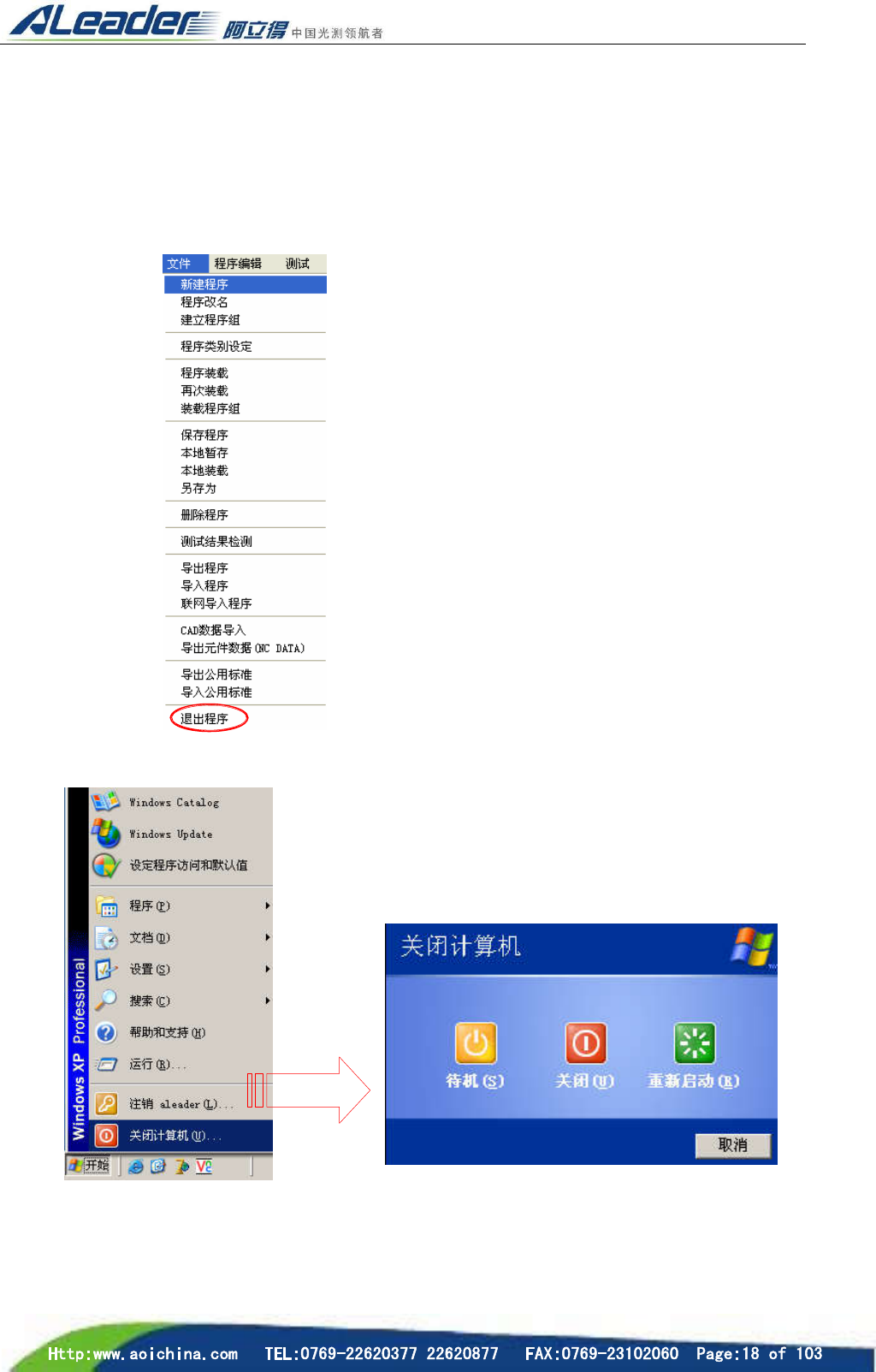 2.10.2 电源的切断 为了避免电脑硬盘可能受到损伤,并且保证测试程序及数据的完整。切断电源时,请务必遵照以下的 操作顺序,来执行系统的关闭处理工作。 反复进行电源的 ON/OFF 动作,会成为设备故障原因之一。一旦切断电源后,请经过最少 20 秒后才 可以再次将设备通电。 操作顺序: 1. 如下图:点击菜单〔文件〕→〔 退出程序 〕项目。 2. 系统自动保存数据并退出测试程序。 3. 点击操作系统 W inXP 的〔开始〕→〔关机〕…