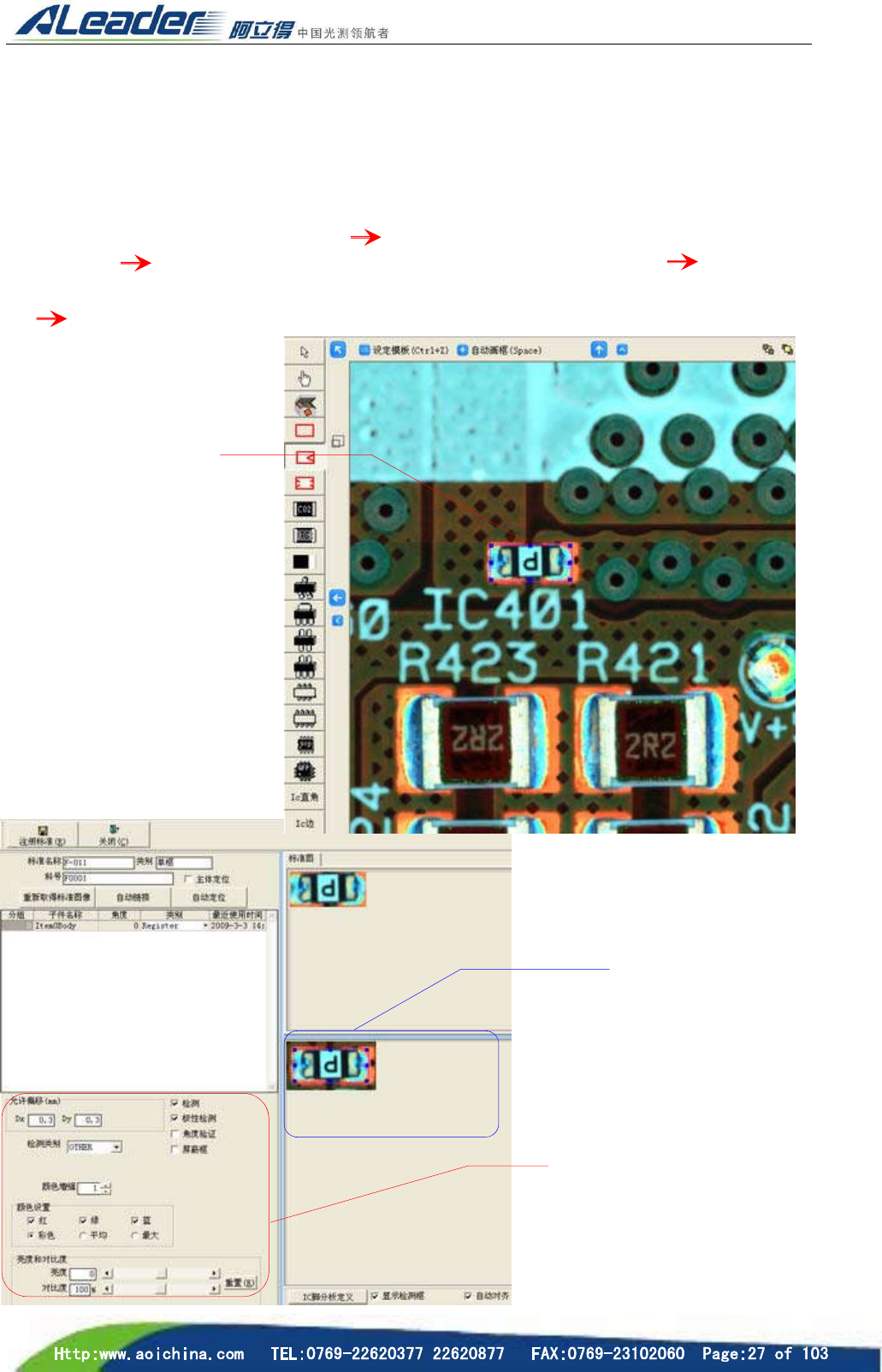 3.3.7.1.1 单框模块的注册 单框模块,一般针对锡点较少的元件,如 0603 以下不具有丝印的元件 (不包括 0603 元件) 的注册,选择左边的元件注册工具模块的单框 在编辑区域所看到的元件上鼠标左键平滑拉出注册 框包括整个元件 选择注册框鼠标右键选择注册标准弹出注册窗口 (快捷键 Alt+R ) 调节好框 的大小(根据需求可修改标准名称名称、料号、允许偏移、颜色、亮度和对比度等参数,一般不需改 动,系统已默认好参数) 点击“注…